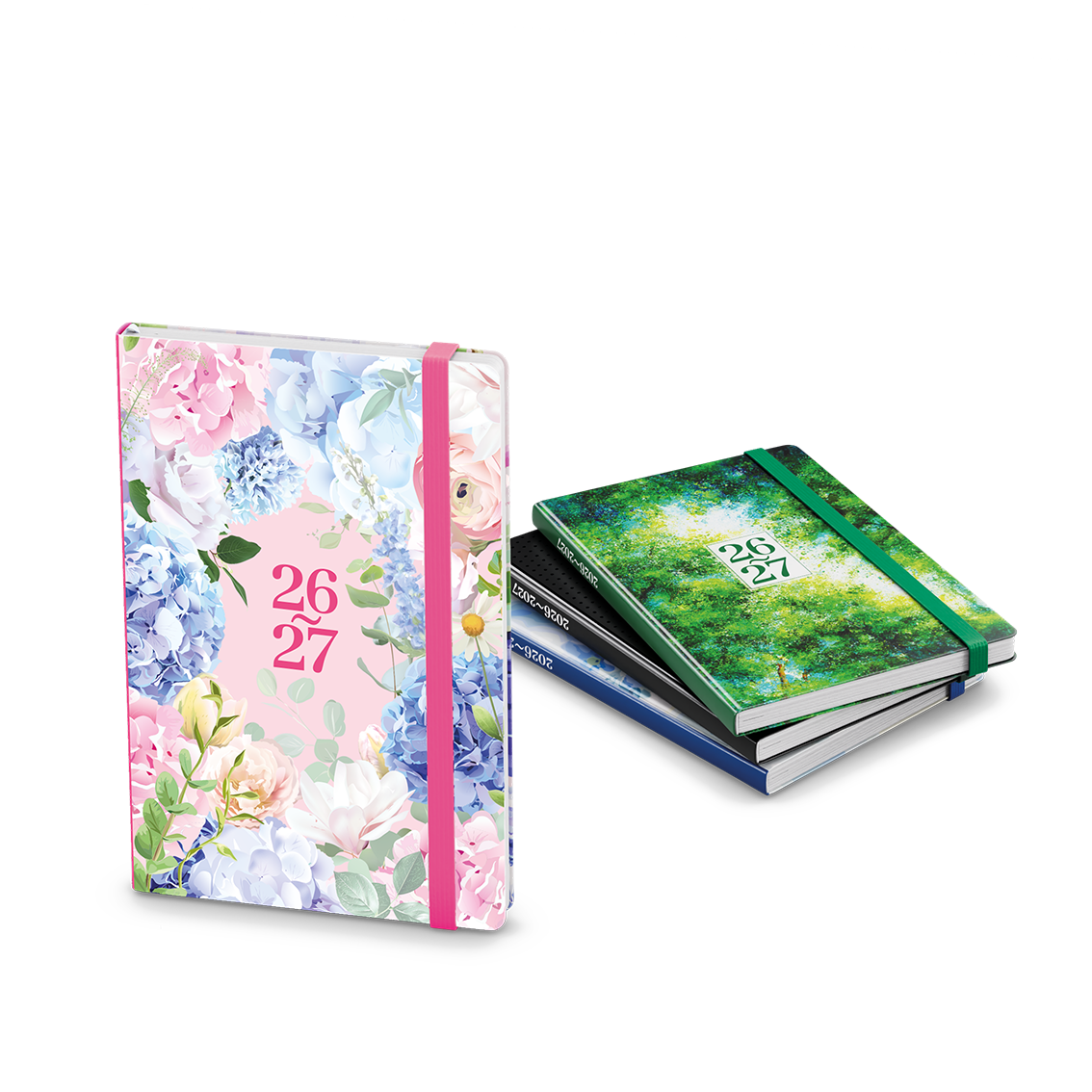 šitá vazba V8, tištěná grafika potažená matným laminem s parciálním lakem, kulaté rohy, gumička, stužka // ofset, 80g/m2
