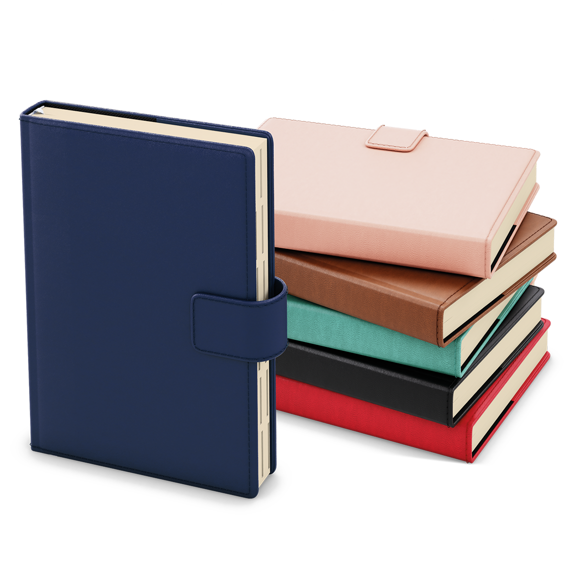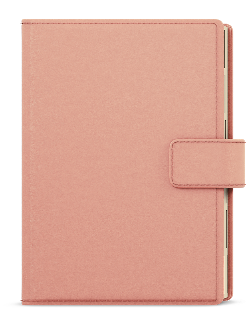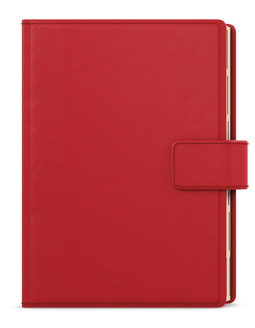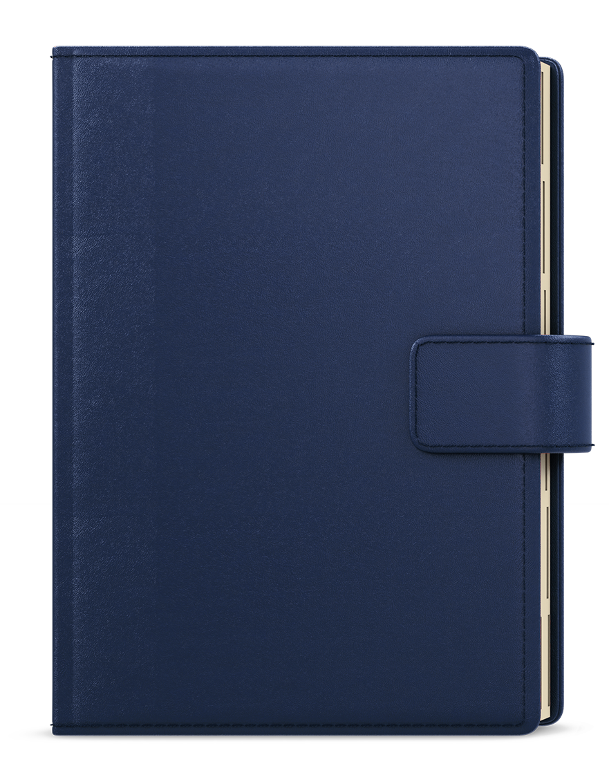 jemný matný materiál, oboustranná pěnová výplň desek, obšití v barvě potahu, magnetická přezka, poutko na tužku, 3 vnitřní kapsy, šitá vazba V8, kapitálky, stužka, perforované rožky, papírová manžeta // ofset, 70g/m2, krémový papír, indexové výseky
