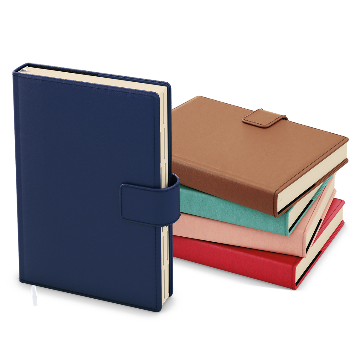 jemný matný materiál, ražba, oboustranná pěnová výplň desek, obšití v barvě potahu, magnetická přezka, poutko na tužku, 3 vnitřní kapsy, šitá vazba V8, kapitálky, stužka, perforované rožky, papírová manžeta