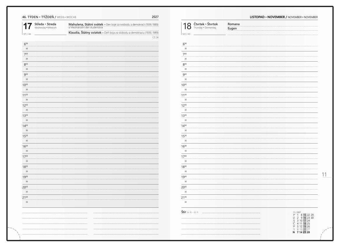 Denní diář A5 vyrobený z oblíbeného materiálu a s jednoduchou ražbou. Výjimečností tohoto diáře je, že soboty i neděle jsou na každé stránce zvlášť.