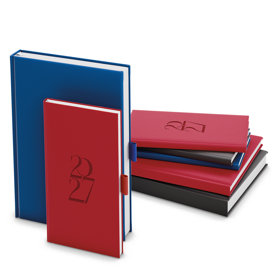 jemně strukturovaný materiál, ražba roku, jednostranná pěnová výplň desek, šitá vazba V8, stužka, perforované rožky, mapa ČR a SR, vlepená kapsa, poutko v barvě // ofset, 70g/m2