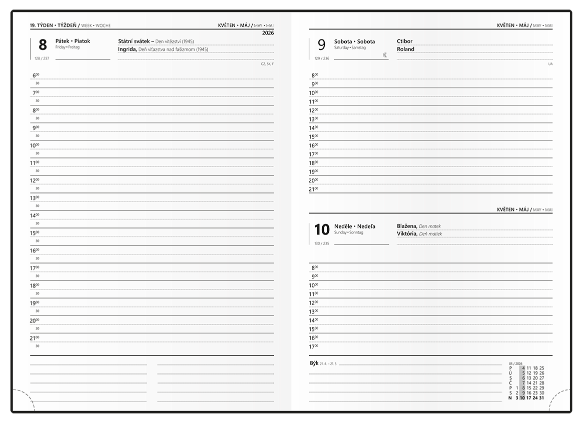 Denní diář formátu A5 je vyráběný z matného hladkého lamina s parciálním lakem, který dodává každému diáři šmrnc. Jedná se nejen o skvělý doplněk, ale také si budete moci efektivněji plánovat Váš čas.