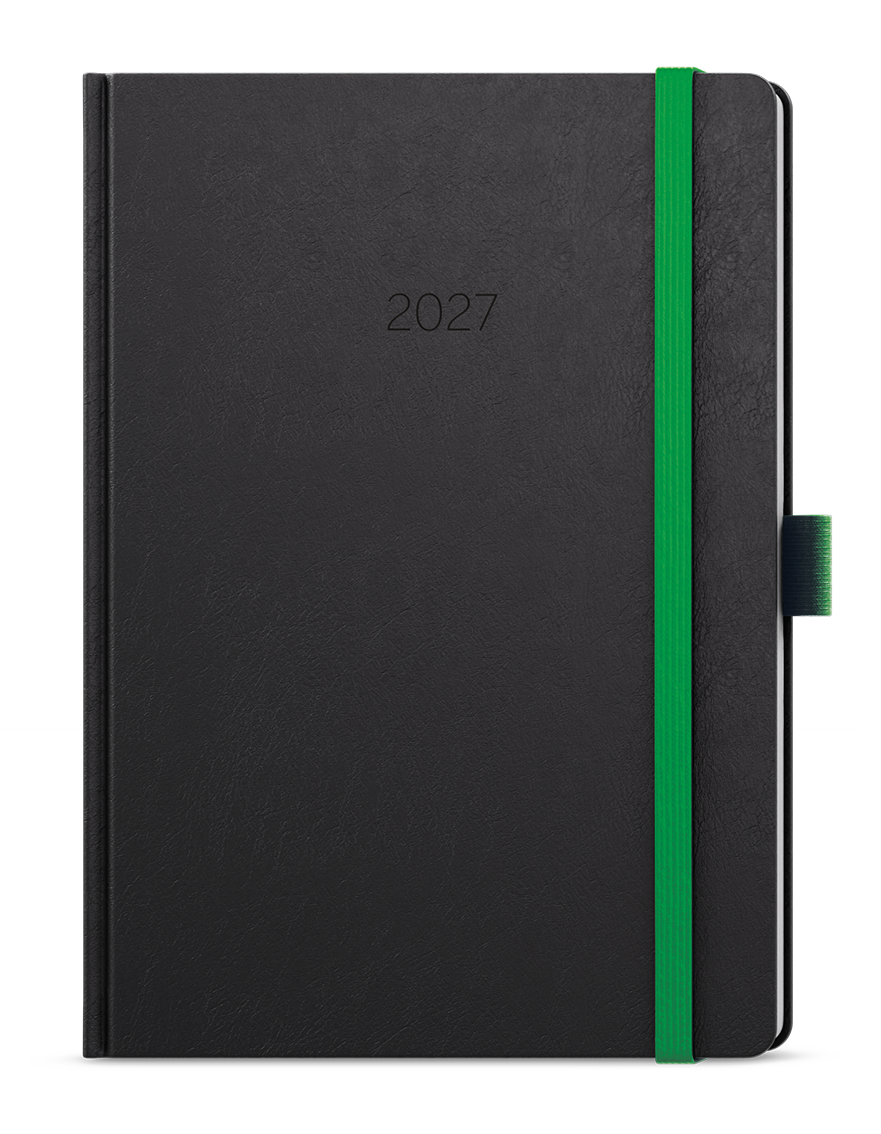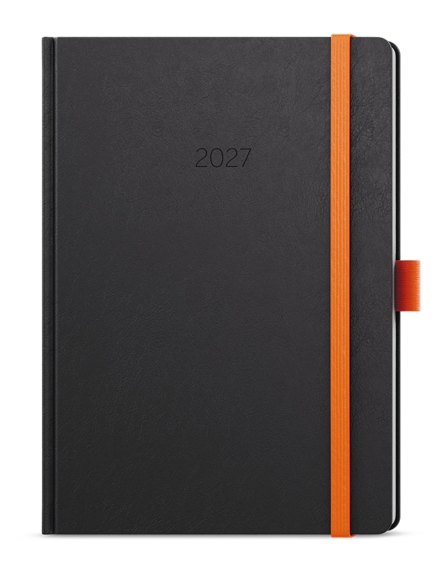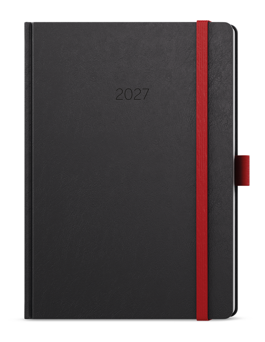 Neobyčejný denní diář s matným povrchem ze strukturovaného materiálu s červenou gumičkou a poutkem. Je vyráběný ve formátu A5, má velký prostor pro poznámky a plánování.