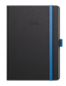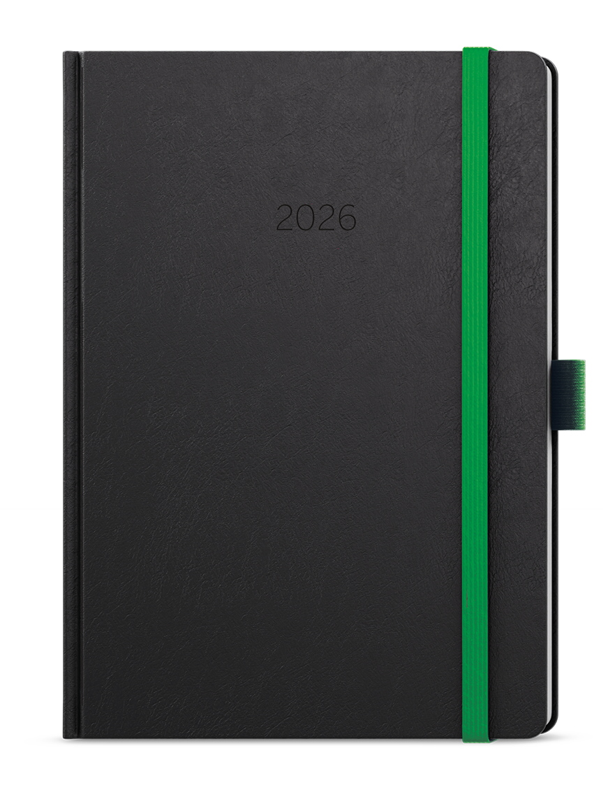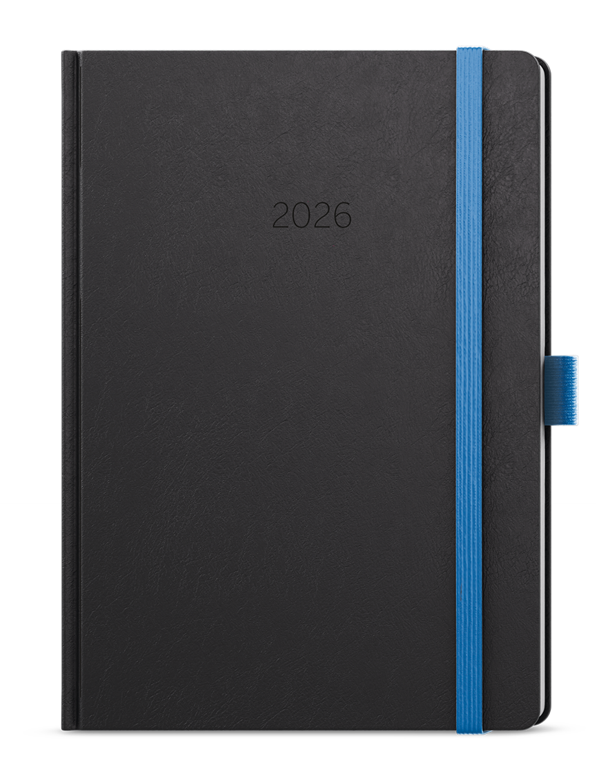 Neobyčejný denní diář s matným povrchem ze strukturovaného materiálu s modrou gumičkou a poutkem. Je vyráběný ve formátu A5, má velký prostor pro poznámky a plánování.