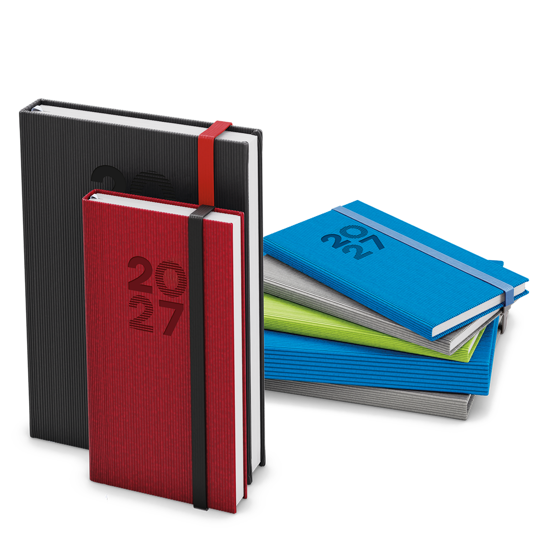 Denní diář formátu A5 vyrobený ze strukturovaného materiálu v oblíbených barvách a s gumičkou. Oblíbená grafika vnitřního bloku Vám pomůže účelně plánovat Vaše dny.