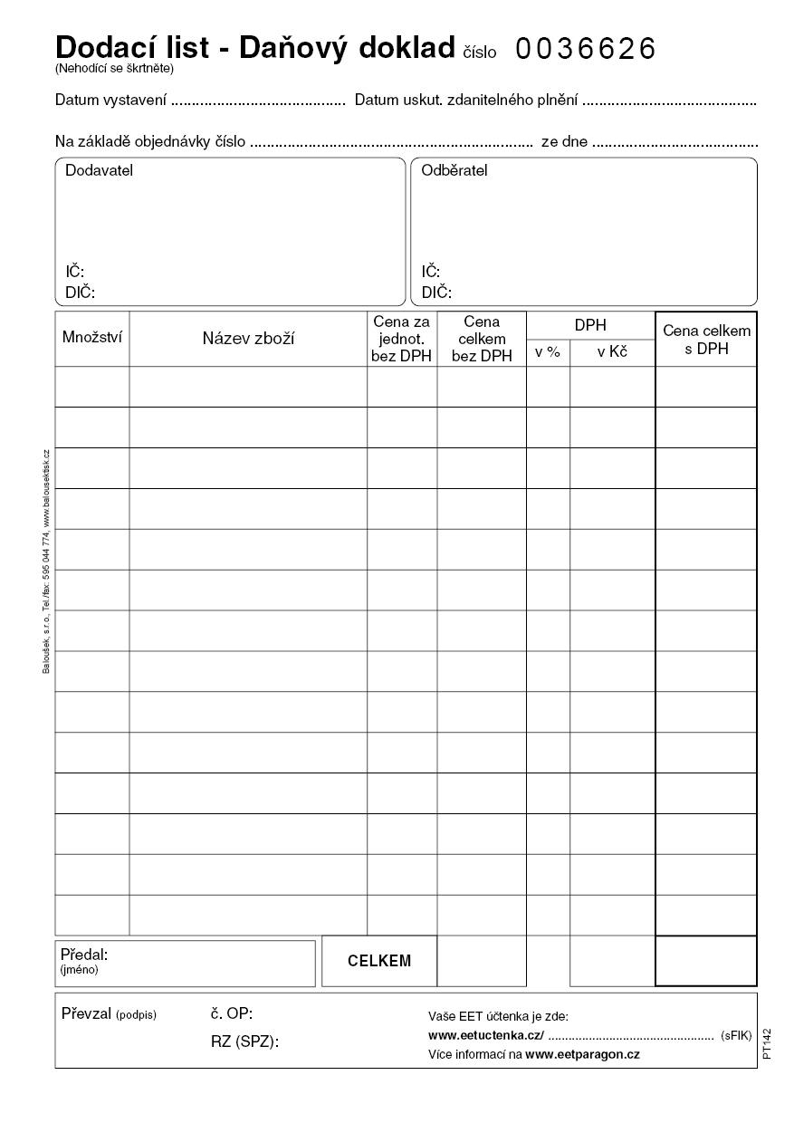 Dotaz na zboží: Dodací list - daňový doklad A5 čísl. - EET (PT142)