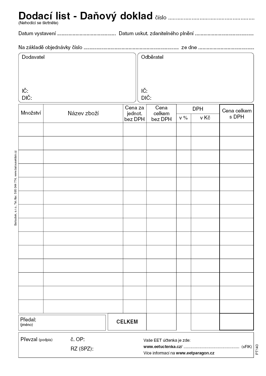 Dotaz na zboží: Dodací list - daňový doklad A5 - EET (PT140)