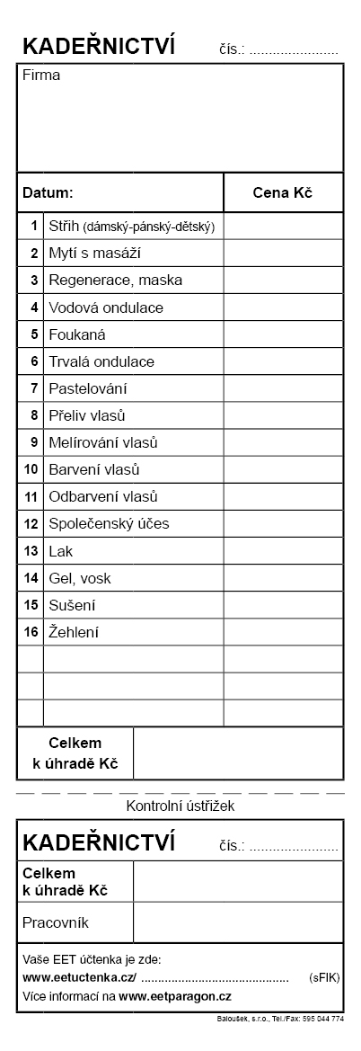 Přímopropisující tiskopis. Je přizpůsoben pro EET evidenci.