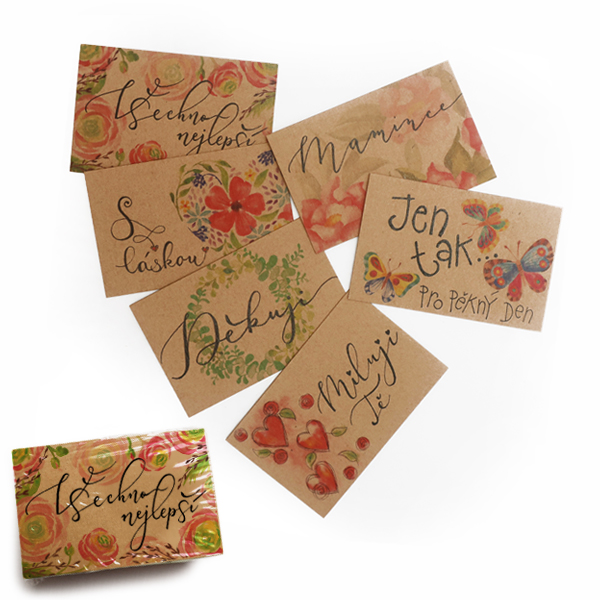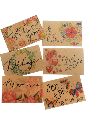 Sada malých děkovacích kartiček s autorským obrázkem a volným polem pro možnost dopsání libovolného textu.