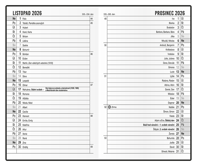 jemný hladký materiál PVC,potisk roku bílou barvou, šitá vazba V1, ofset, 70g/m2