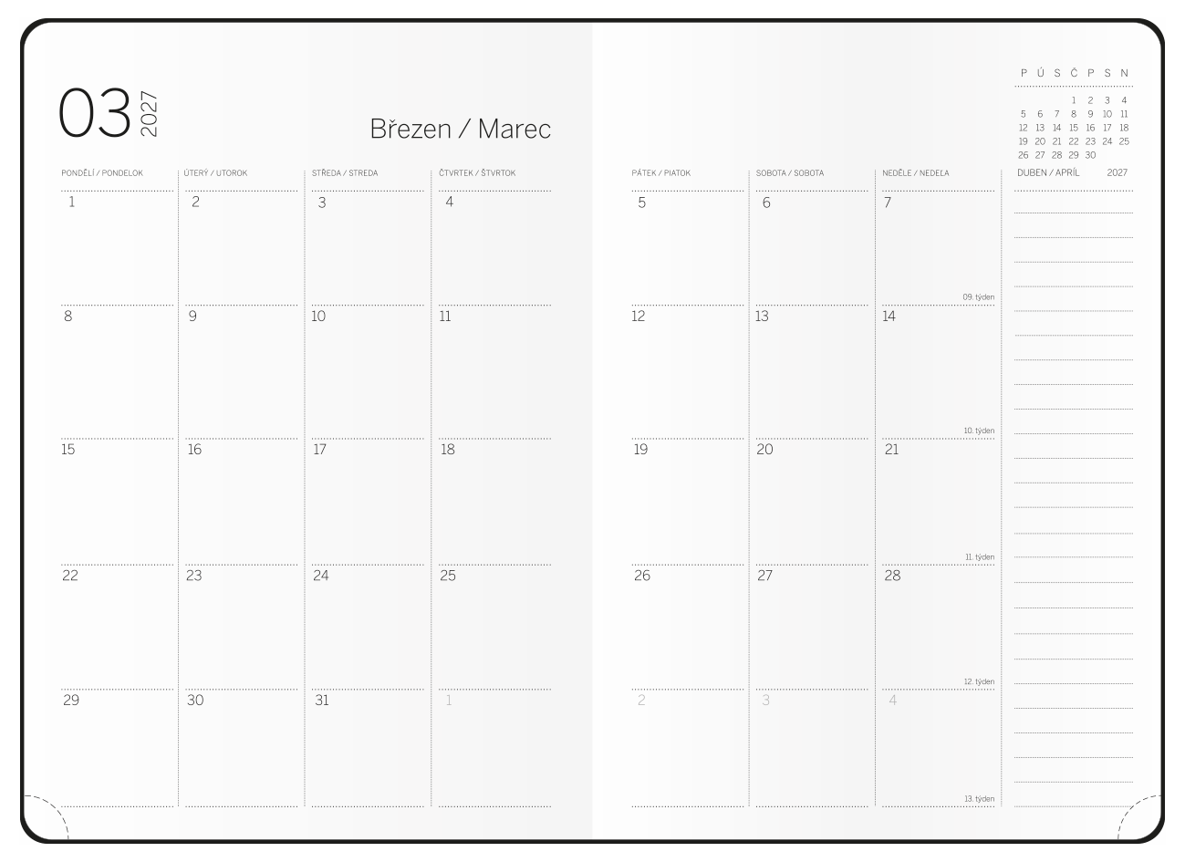 Unikátní měsíční diář s poznámkovým notesem. Na předních stranách tohoto managerského diáře můžete využít přehledné měsíční kalendárium a na zbývajících stranách na Vás čeká linkovaný i prázdný blok na Vaše poznámky.