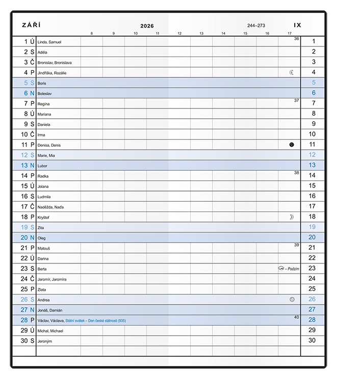 jemný hladký materiál PVC,potisk roku bílou barvou, šitá vazba V1, ofset, 70g/m2
