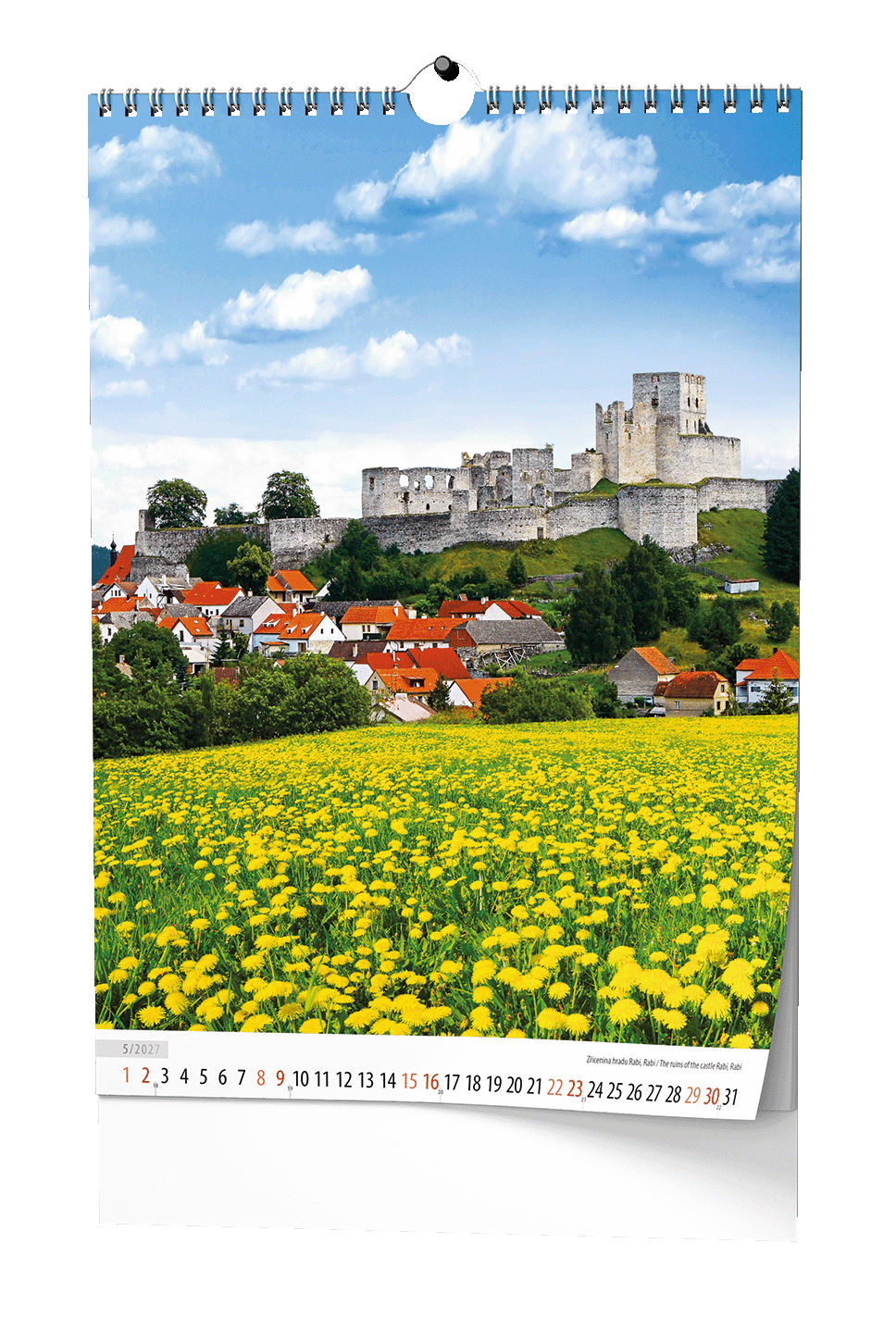 kovová spirála "twin wire" po celé šířce kalendáře s háčkem pro zavěšení, obálka je tištěna na křídový papír s gramáží 150 g/m2, spodní karton je z kvalitní bílé lepenky v gramáži 600 g/m2 // křída lesk, 135 g/m2