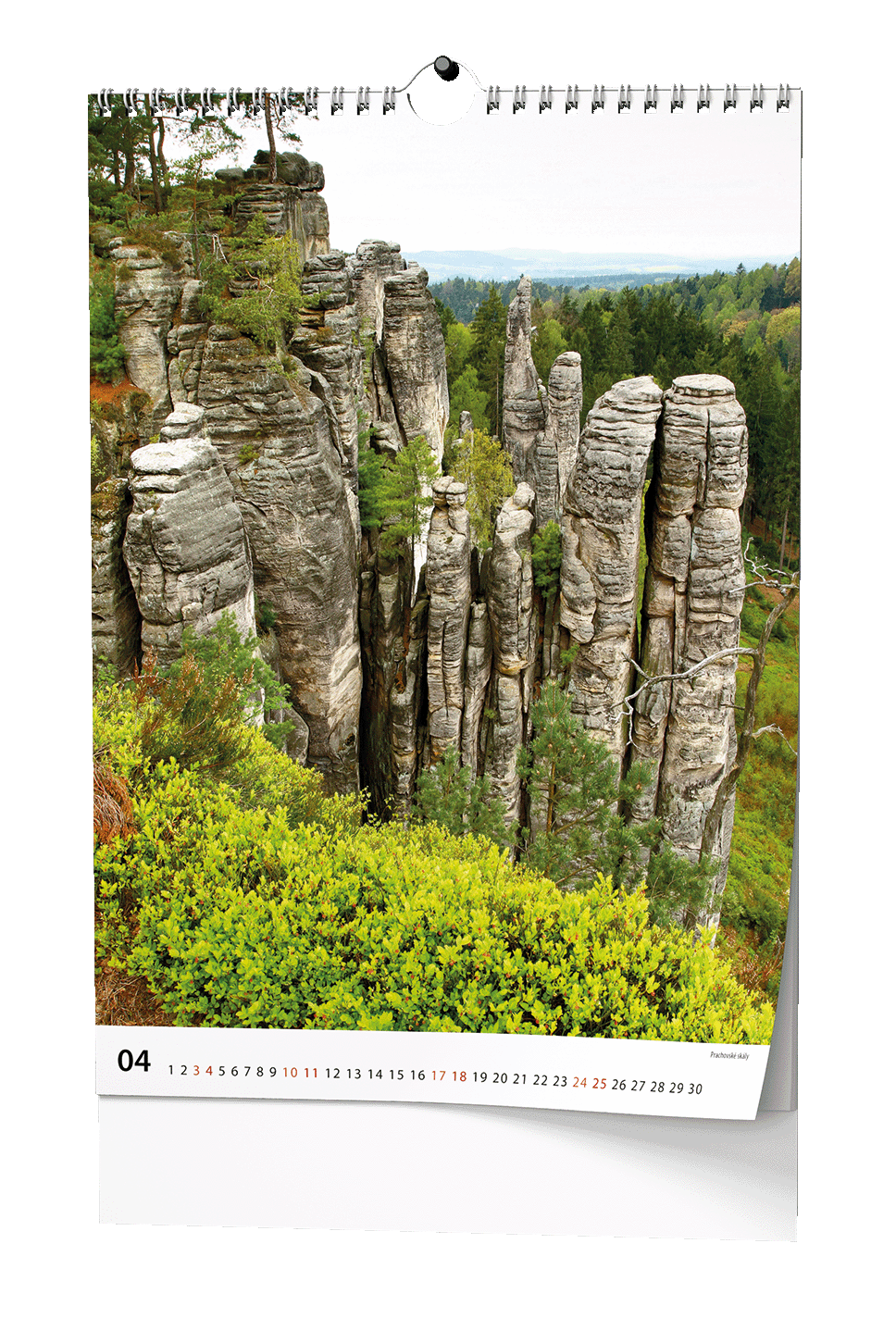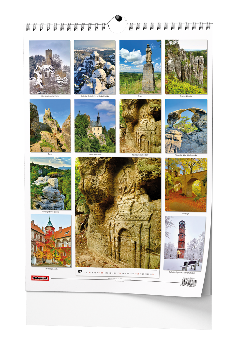 kovová spirála "twin wire" po celé šířce kalendáře s háčkem pro zavěšení, obálka je tištěna na křídový papír s gramáží 150 g/m2, spodní karton je z kvalitní bílé lepenky v gramáži 600 g/m2 // křída lesk, 135 g/m2