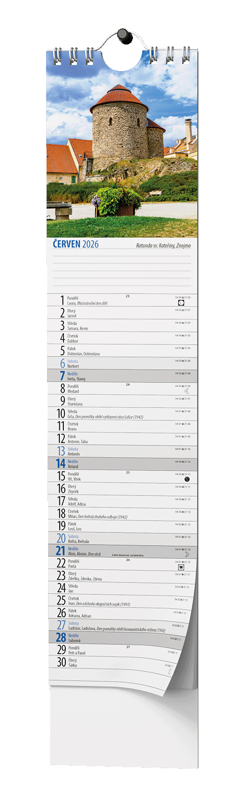 Dvojitá kovová spirála "twin wire" po celé šířce kalendáře s háčkem pro zavěšení