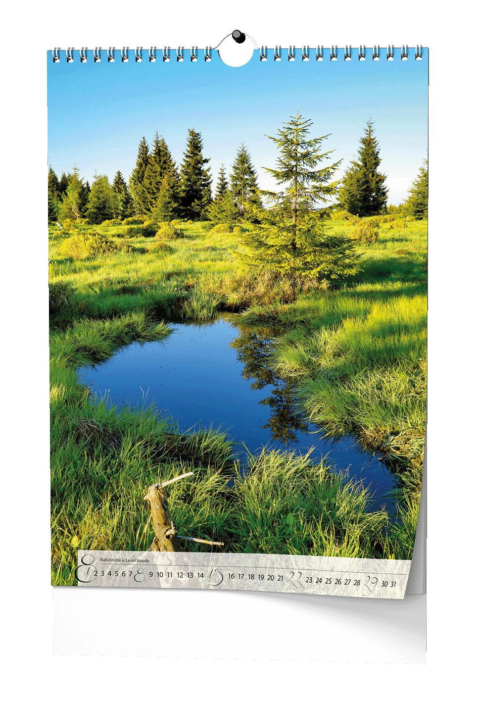 kovová spirála "twin wire" po celé šířce kalendáře s háčkem pro zavěšení, obálka je tištěna na křídový papír s gramáží 150 g/m2, spodní karton je z kvalitní bílé lepenky v gramáži 600 g/m2 // křída lesk, 135 g/m2
