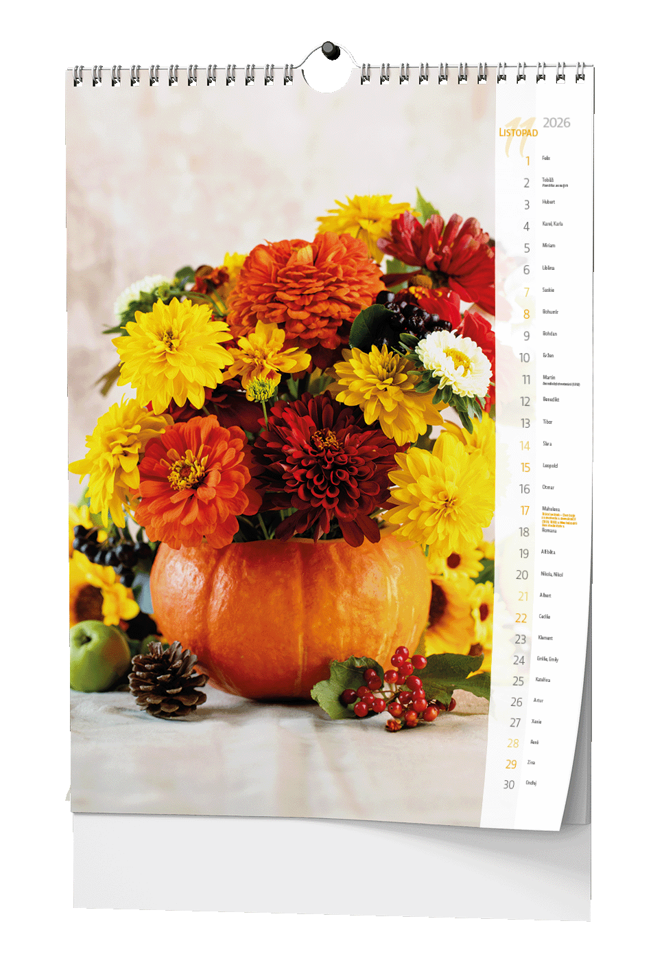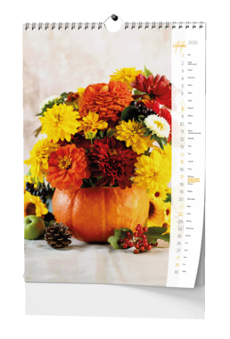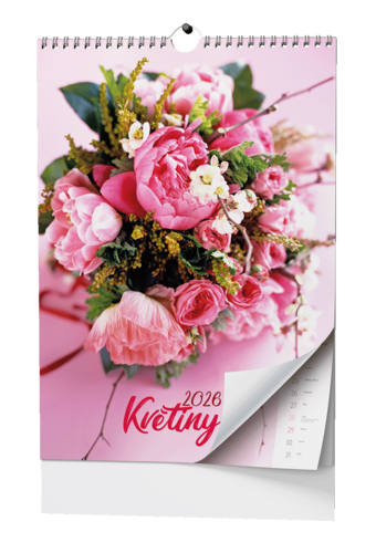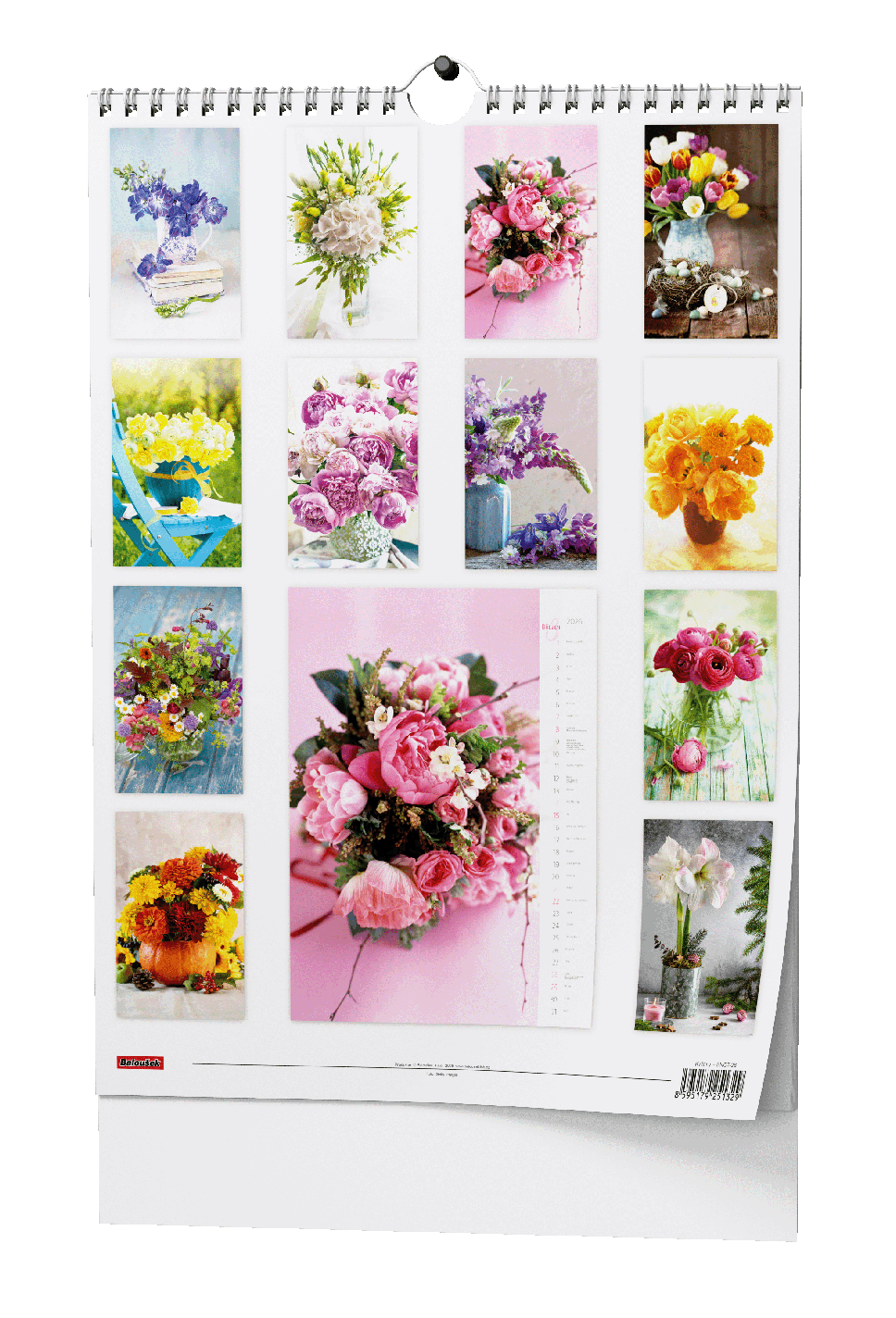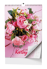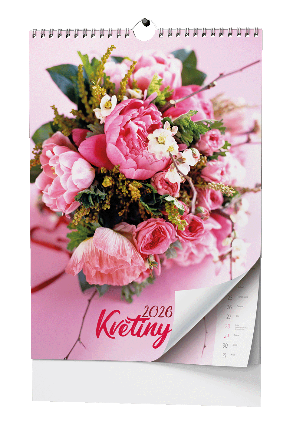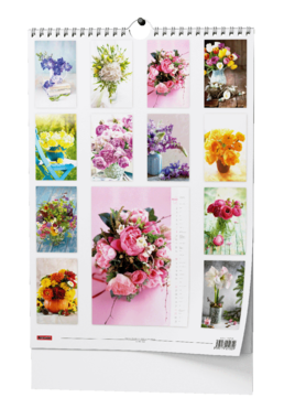 Nástěnný kalendář s obrázky barevných kytic a květů.