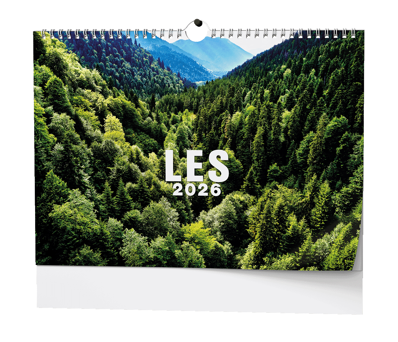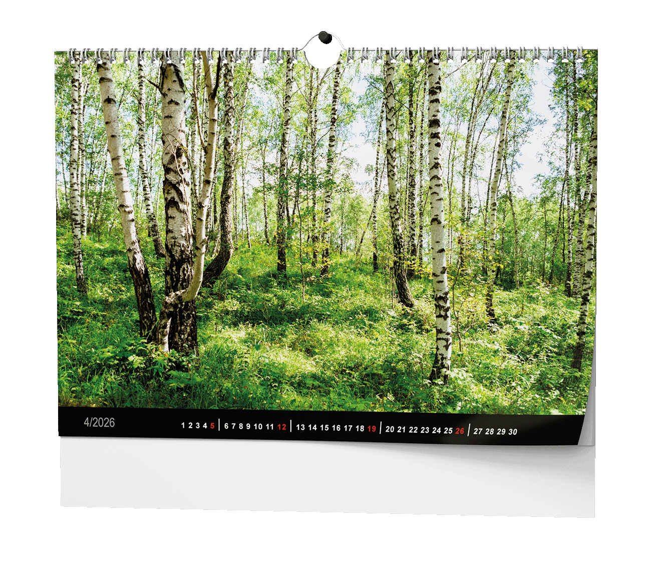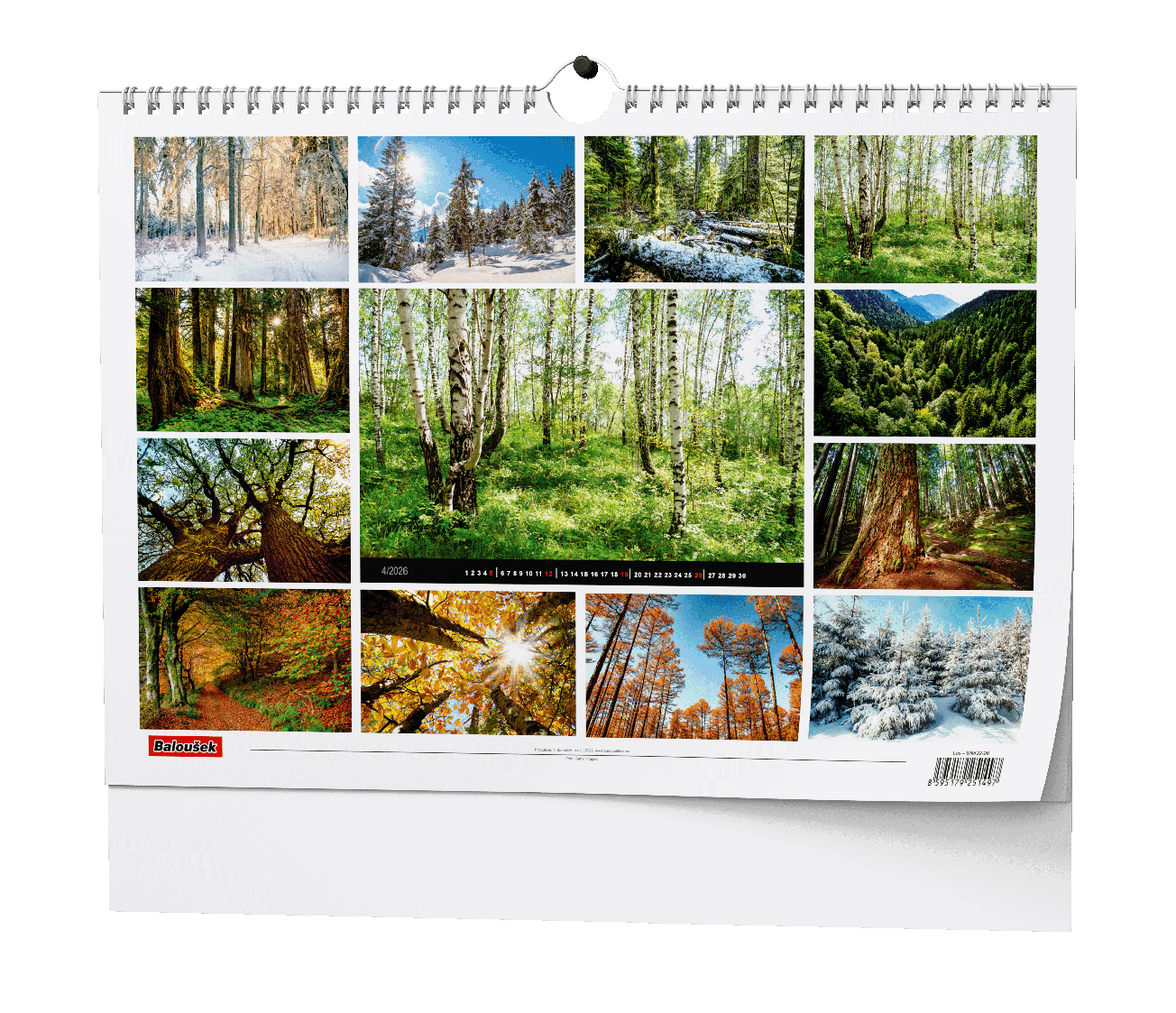 Nástěnný kalendář s obrázky působivých lesních scenérií.