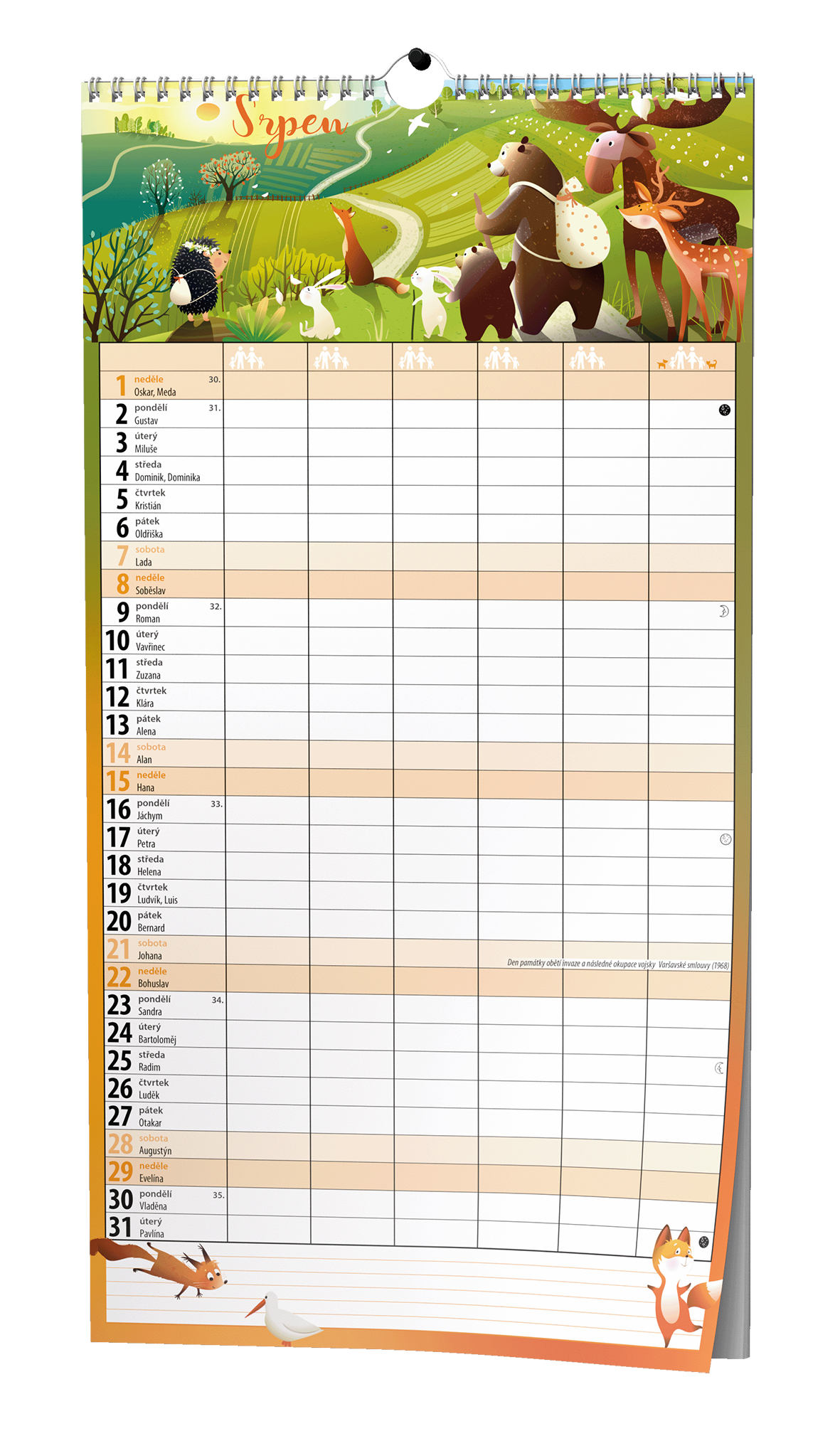 kovová spirála "twin wire" po celé šířce kalendáře s háčkem pro zavěšení, obálka je tištěna na křídový papír s gramáží 150 g/m2, spodní karton je z kvalitní bílé lepenky v gramáži 600 g/m2