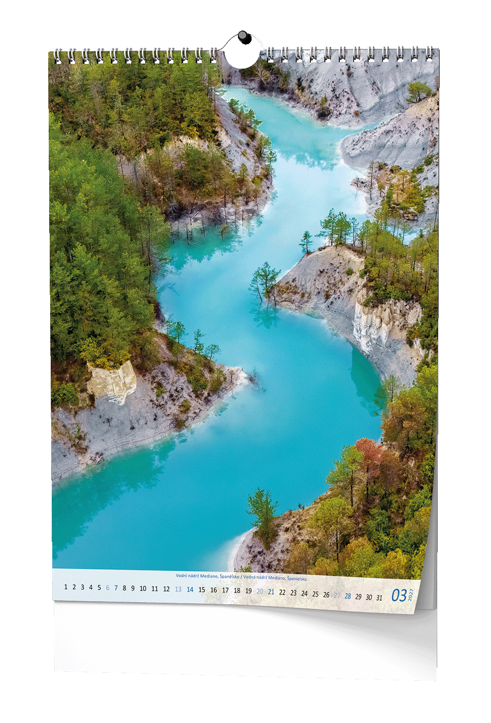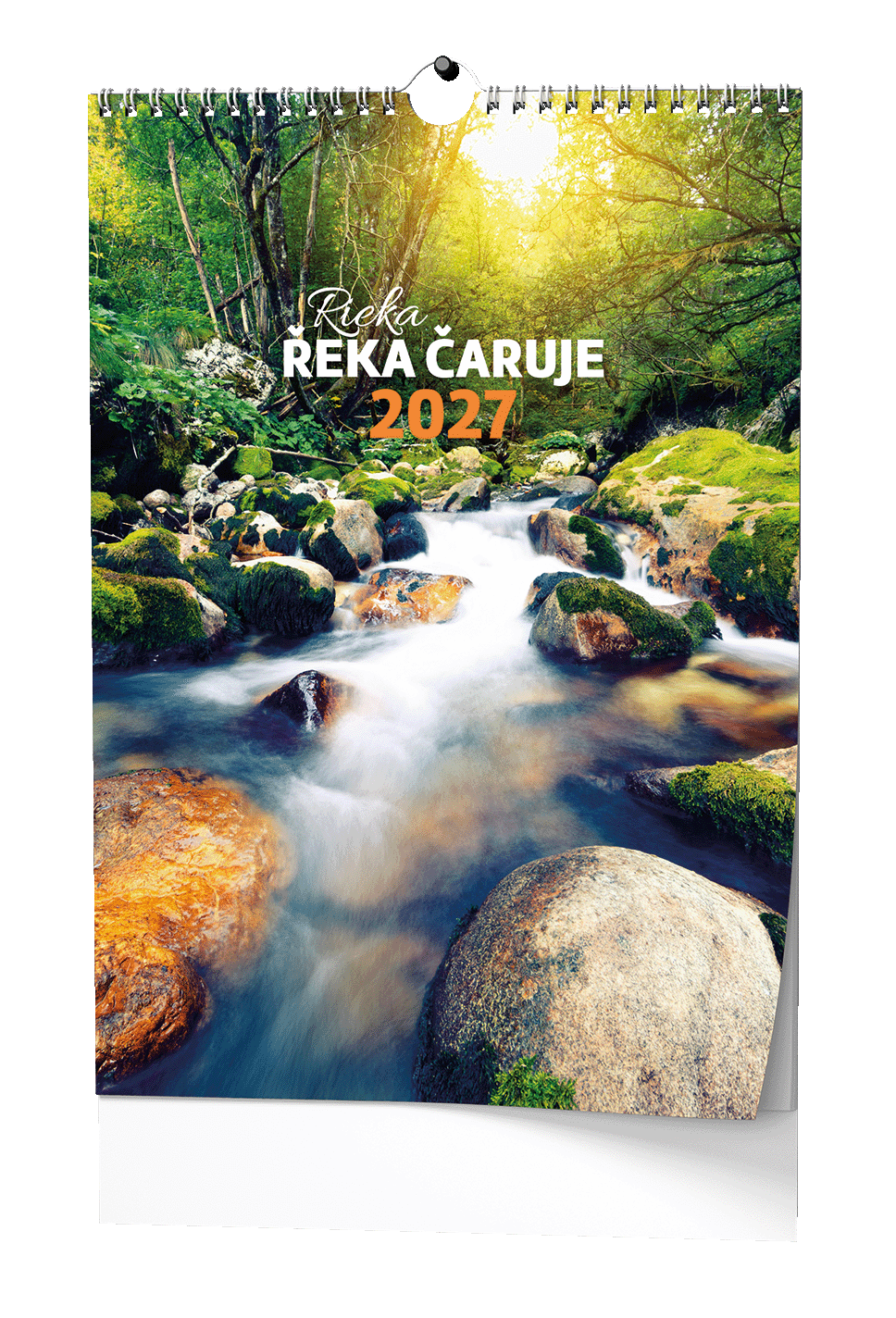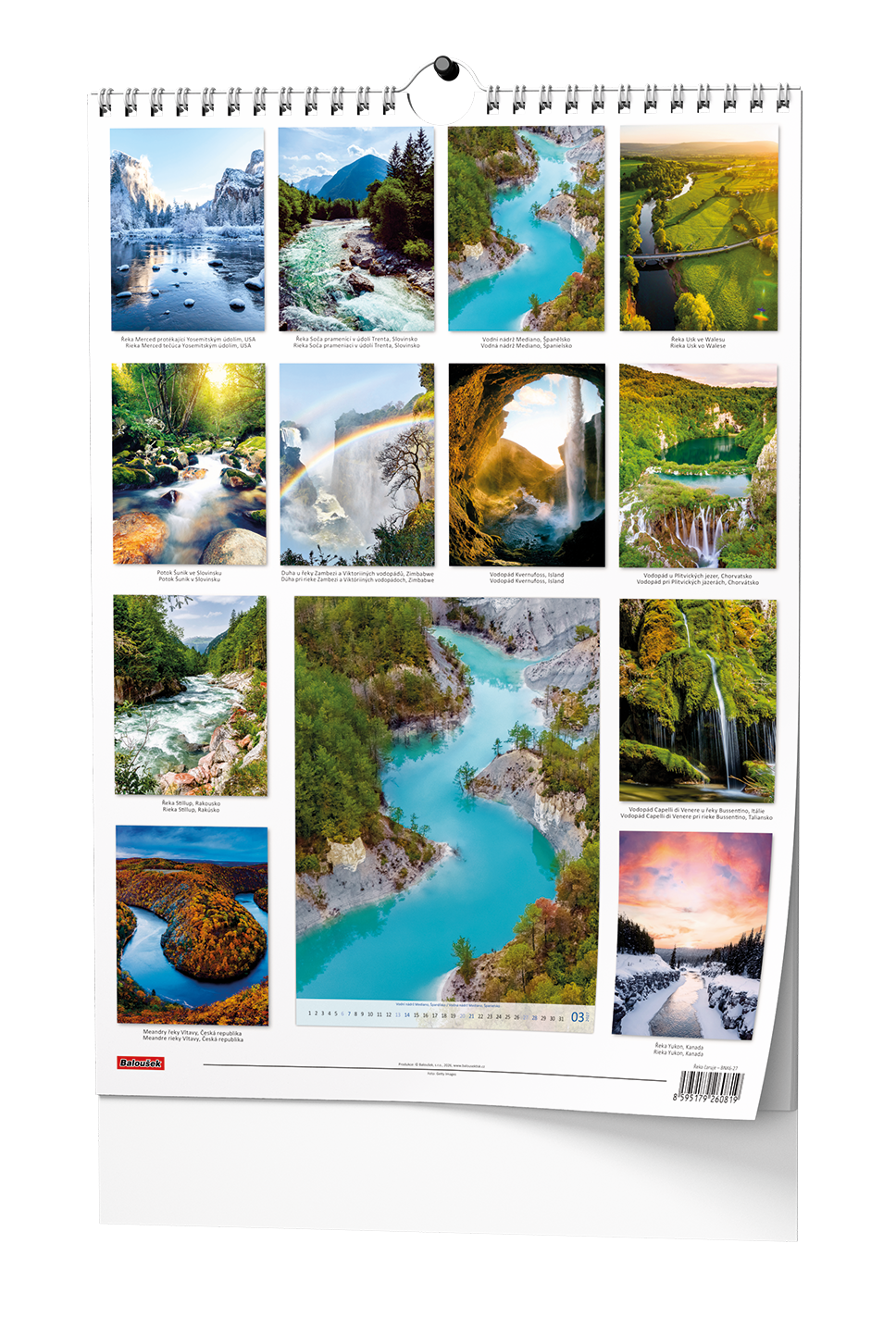 Nástěnný kalendář s obrázky působivých řek a přírodních scenérií.