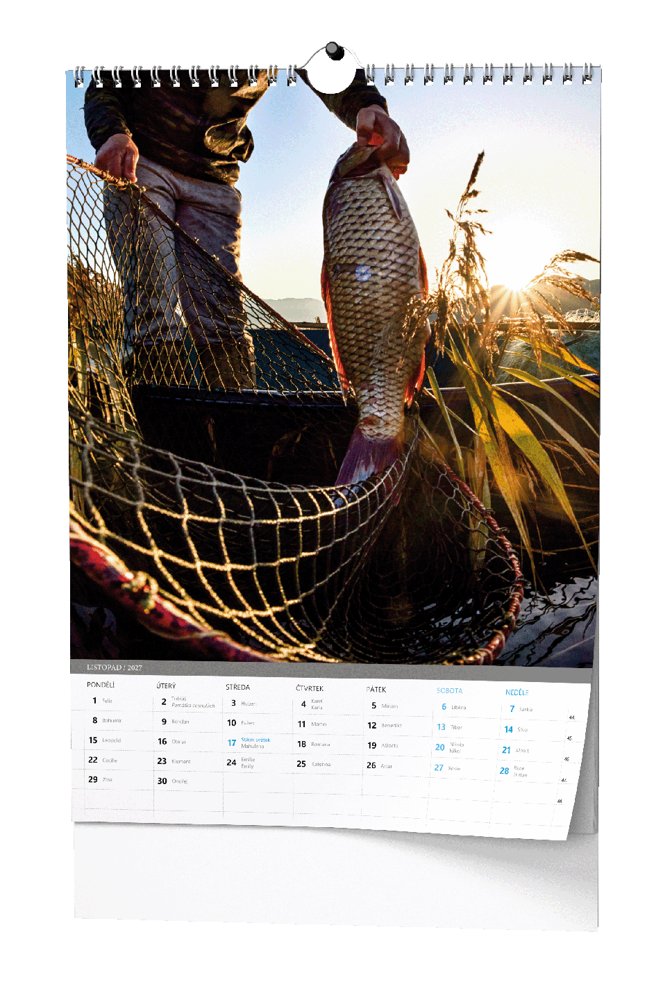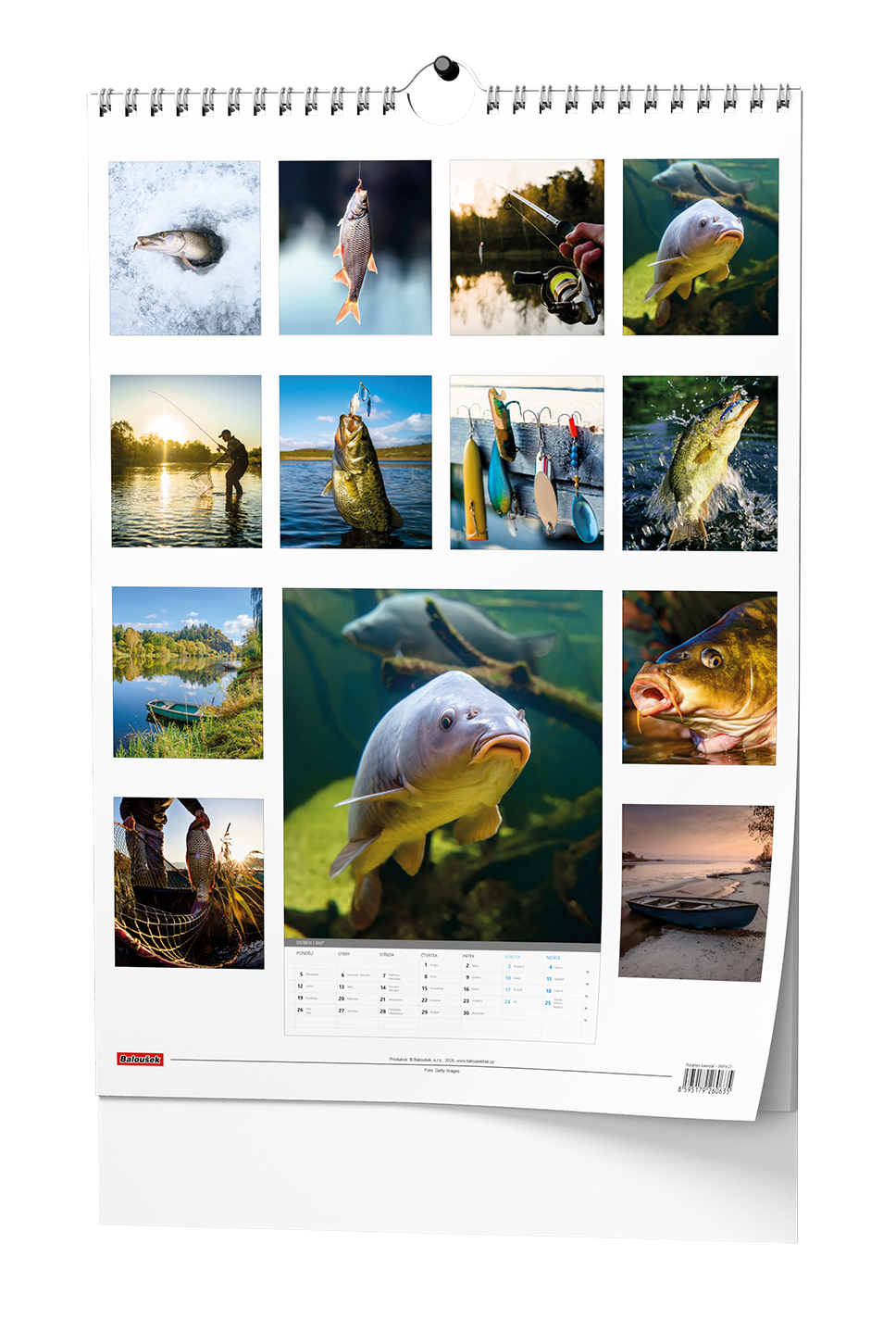 kovová spirála "twin wire" po celé šířce kalendáře s háčkem pro zavěšení, obálka je tištěna na křídový papír s gramáží 150 g/m2, spodní karton je z kvalitní bílé lepenky v gramáži 600 g/m2 // křída lesk, 135 g/m2