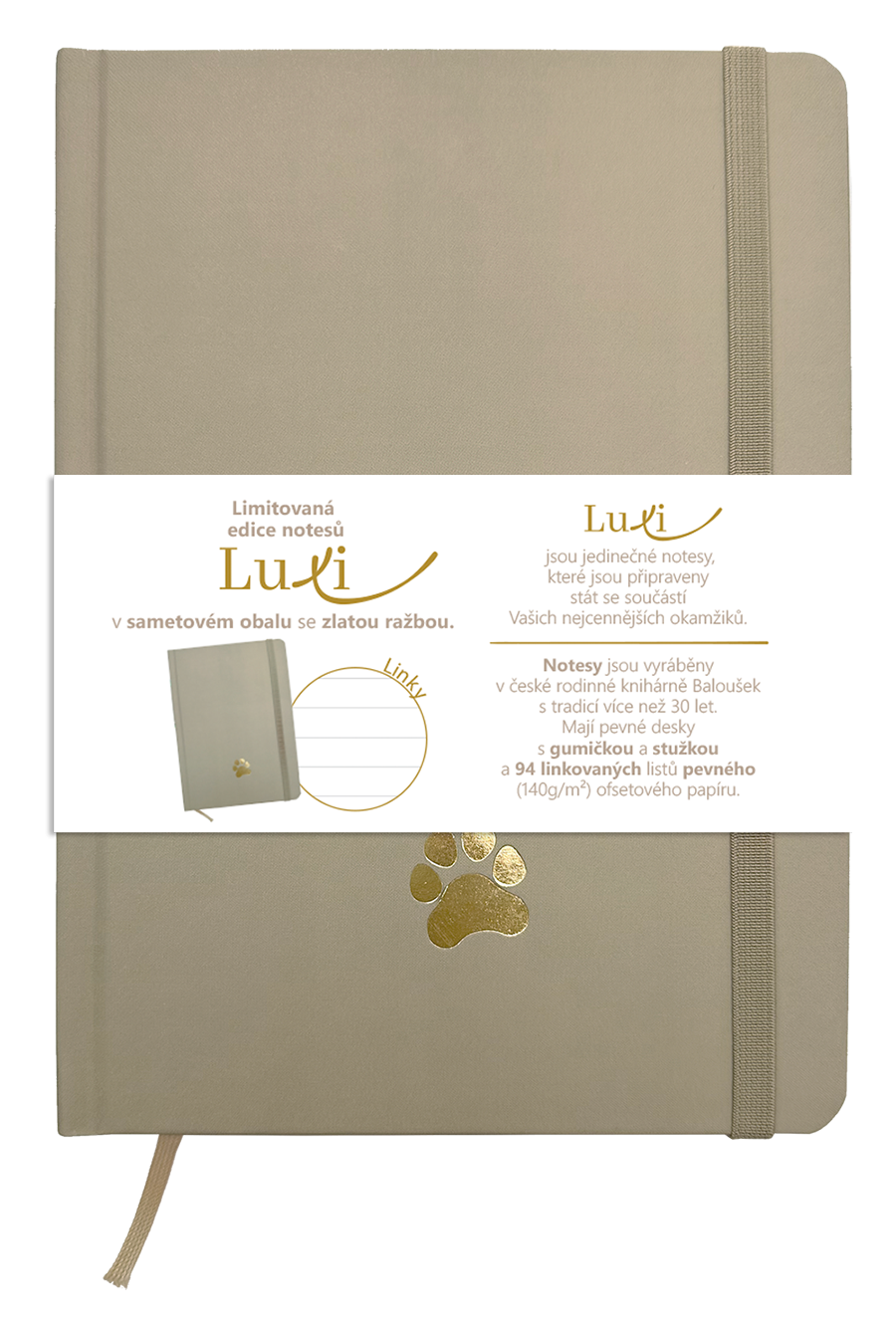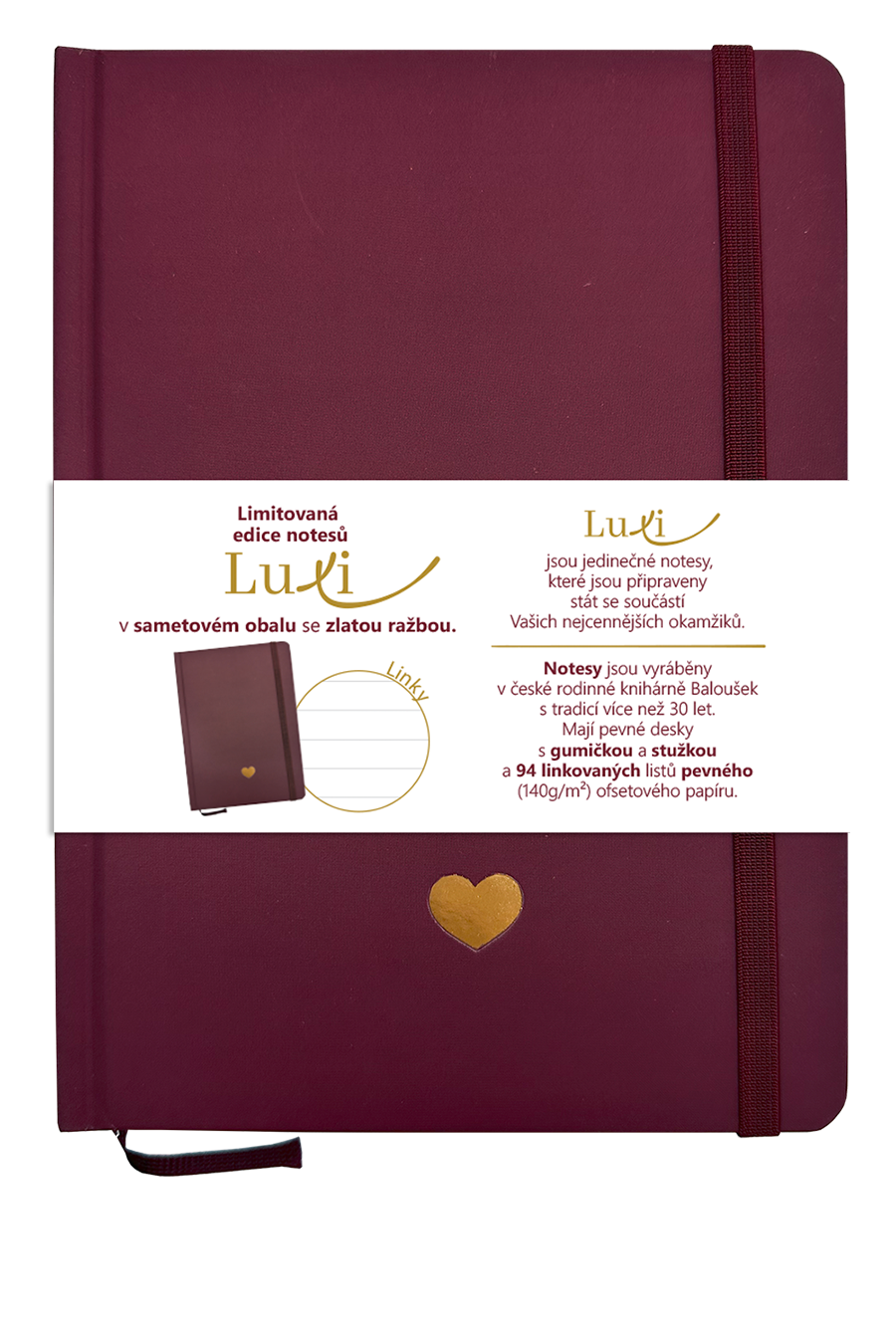 Limitovaná edice linkovaných notesů se sametovým přebalem v moderní bordó barvě a se zlatým motivem Srdce. Luxi jsou notesy se stuhou a s gumičkou pro všechna Vaše tvoření a psaní.