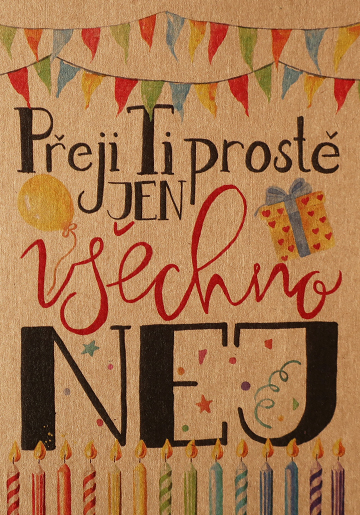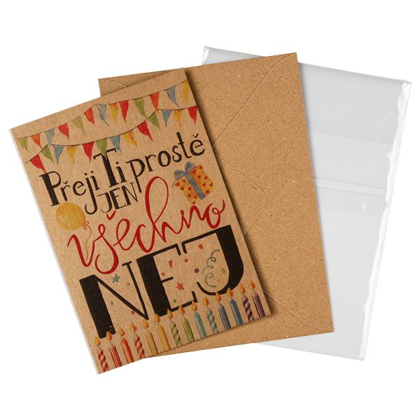 Přání je vyrobeno z recyklovaných materiálů. Kraft je odolný a uchovává si přirozenou barvu a texturu, která nám je velmi sympatická. Zároveň výroba tohoto papíru není nijak složitá, a tak minimálně zatěžuje životní prostředí.