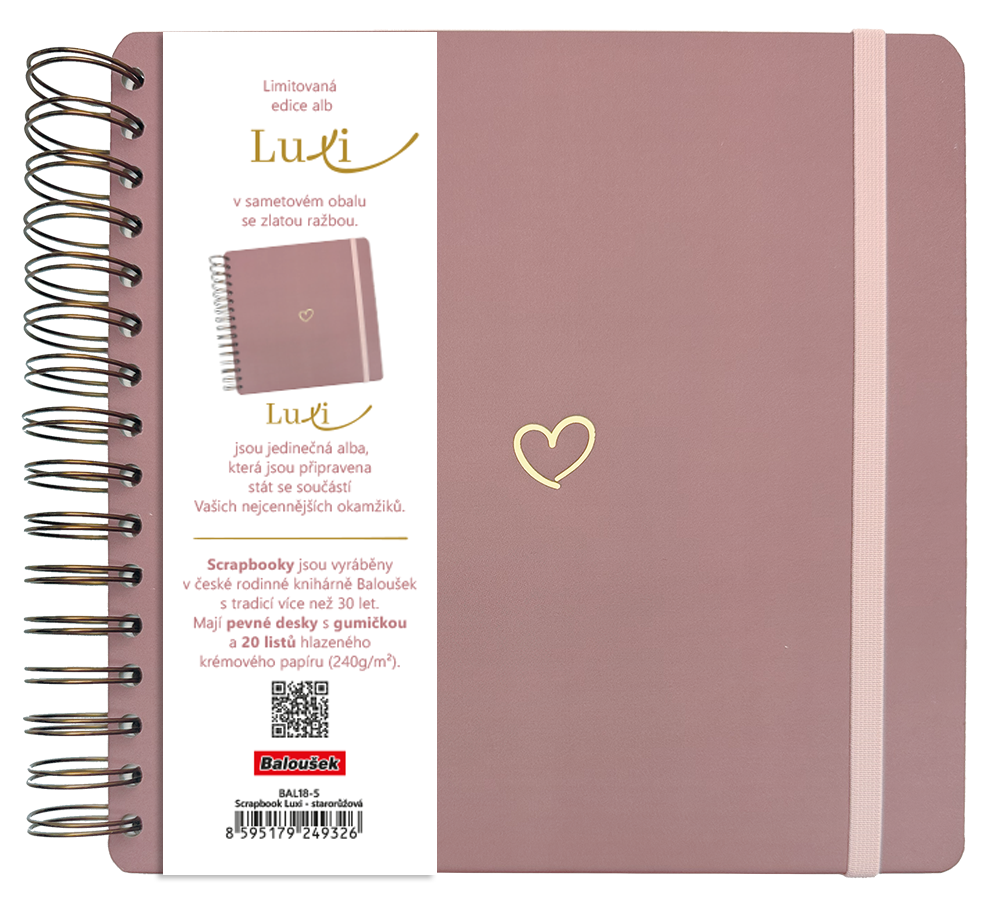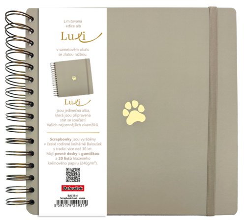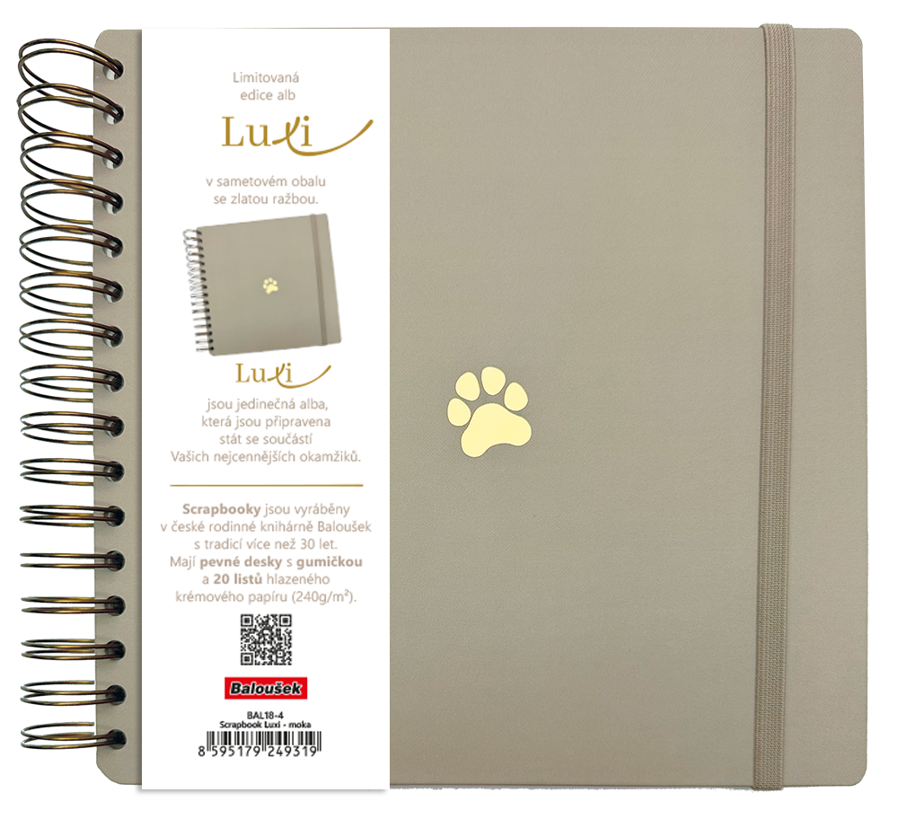 Limitovaná edice scrapbooků se sametovým přebalem v moderní moka barvě a se zlatým motivem Tlapky. Luxi jsou jedinečná alba s krémovým papírem, kroužkovou vazbou a s gumičkou pro všechna Vaše tvoření.