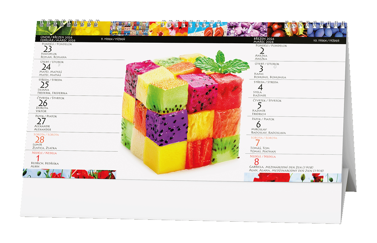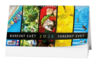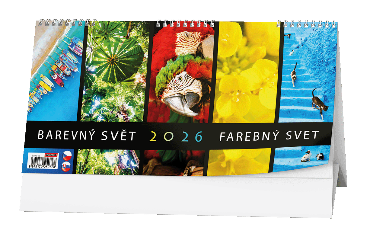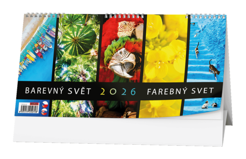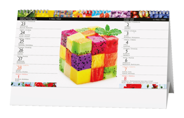 Stolní kalendář se čtrnáctidenním kalendáriem a pestrobarevnými motivy.