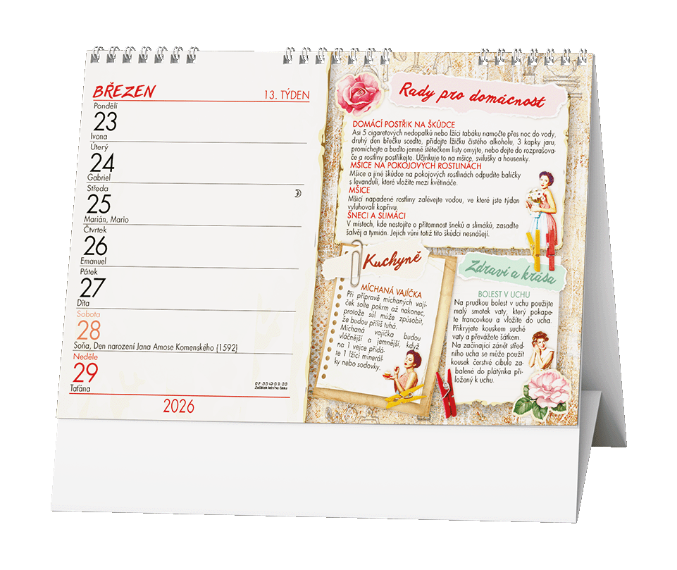 Stolní kalendář s týdenním kalendáriem a s tipy a triky pro domácnost.