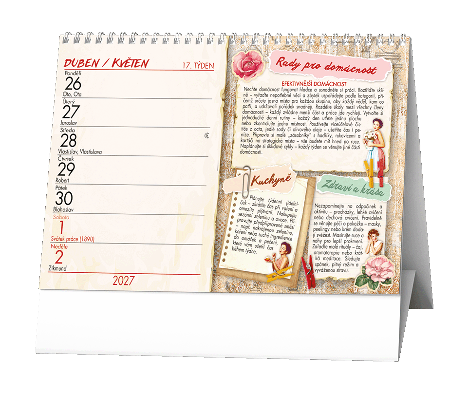 Stolní kalendář s týdenním kalendáriem a s tipy a triky pro domácnost.