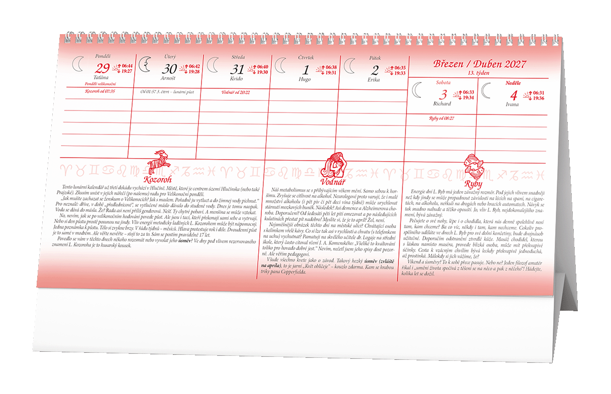 Oblíbený lunární kalendář pana Pavla Skácela s týdenním kalendáriem, s horoskopy a lunárními fázemi.