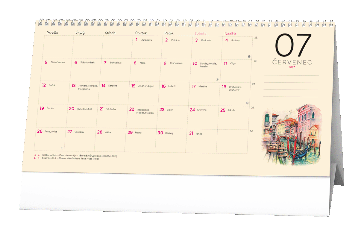 Výjimečný stolní kalendář s měsíčním kalendáriem, laděný do jemných barevných tónů s prostorem pro poznámky a plánování.