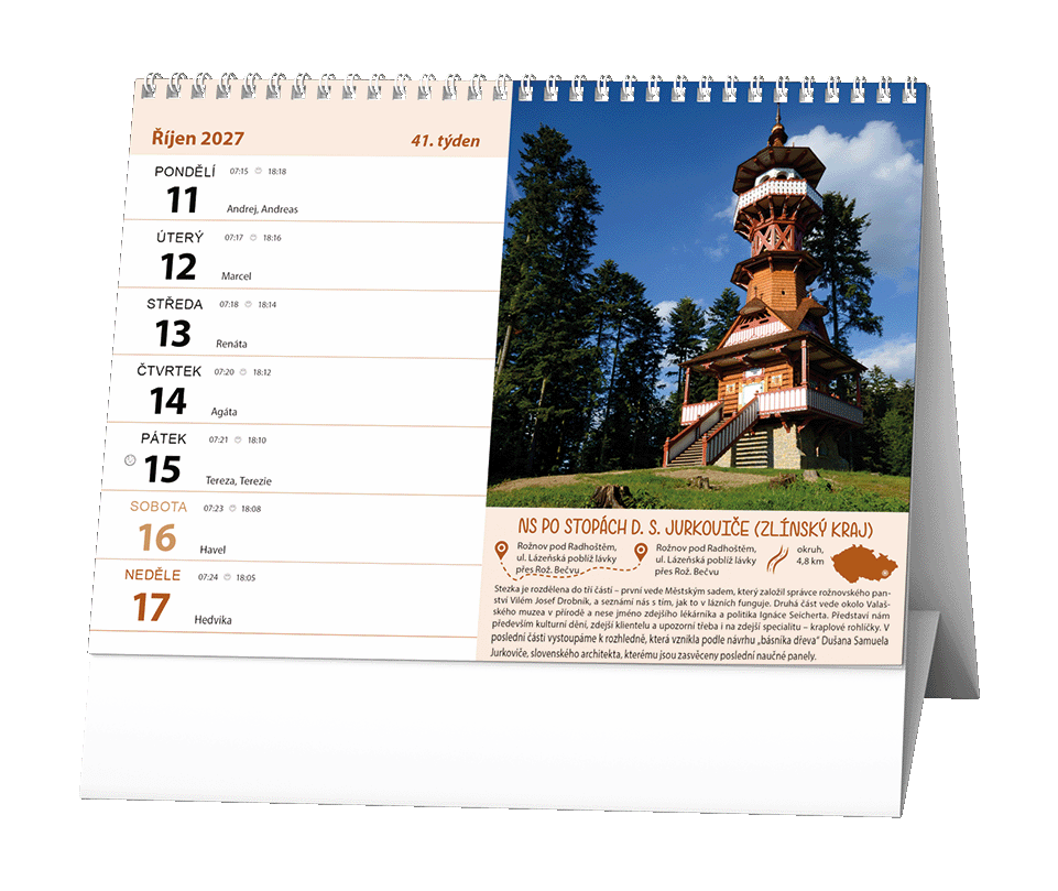 Stolní kalendář s týdenním kalendáriem s informacemi o naučných stezkách v naší zemi.