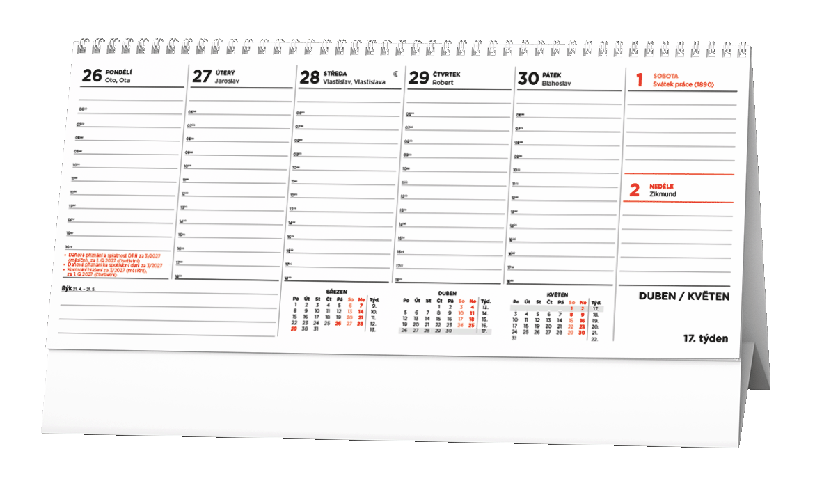 Stolní plánovací kalendář s časy a velkým prostorem na poznámky je skvělý doplněk pro Vaše plánování práce či volného času.