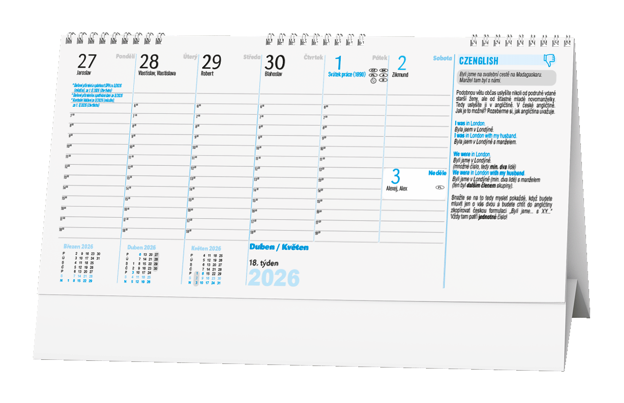 Daňový kalendář s týdenním kalendáriem a prostorem pro plánování. Díky anglickým frázím si můžete zopakovat své jazykové znalosti.