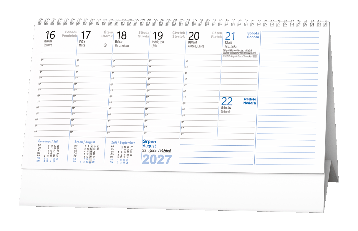 kovová spirála "twin wire", obálka je tištěna na křídový papír s gramáží 135 g/m2, stojánek je z kvalitní bílé lepenky o gramáži 600g/m2 // ofset, 70g/m2