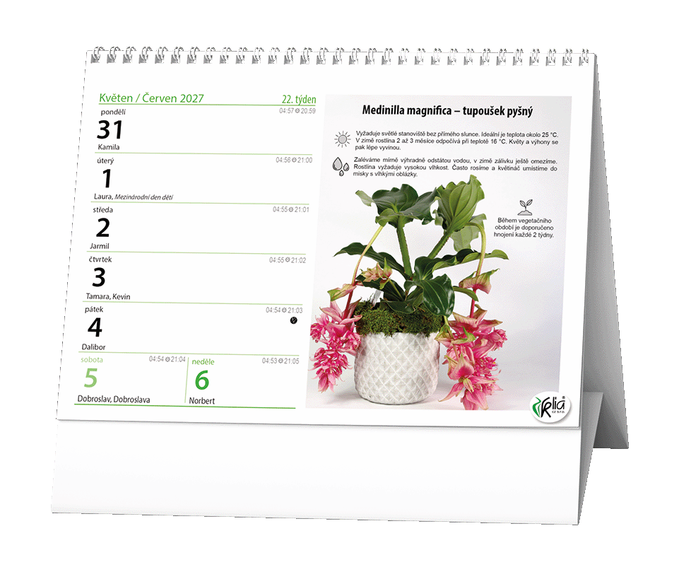 Stolní kalendář s týdenním kalendáriem a s informacemi o péči o pokojové květiny.