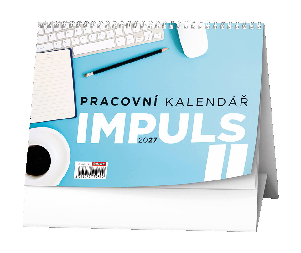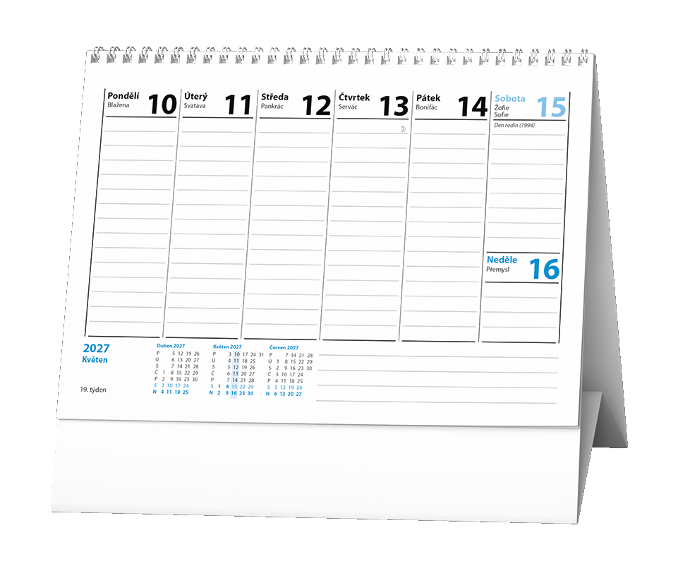 Jednoduchý a praktický pracovní kalendář s týdenním kalendáriem v modro-bílé barevné kombinaci.