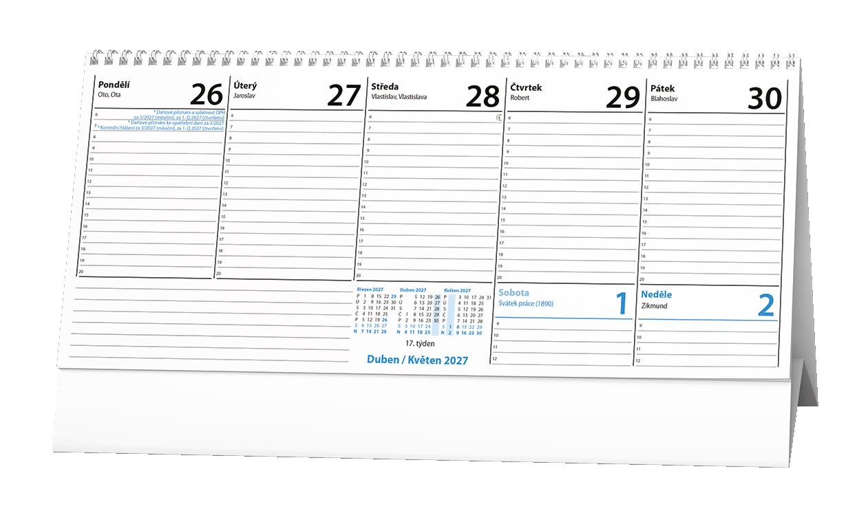 Jednoduchý a praktický pracovní kalendář s týdenním kalendáriem ve větším formátu a s prostorem pro poznámky a plánování.