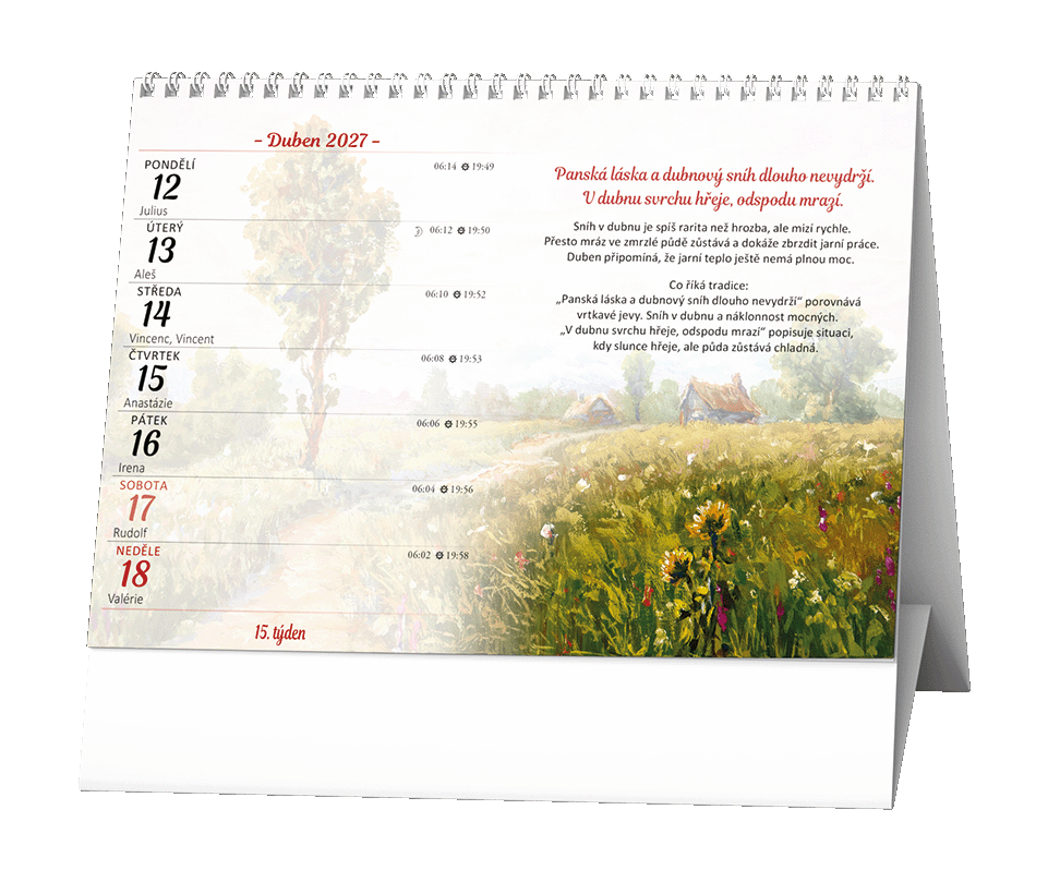 Stolní kalendář s týdenním kalendáriem a pranostikami na každý týden.