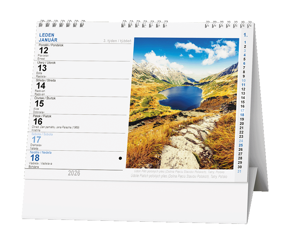 Stolní kalendář s týdenním kalendáriem s obrázky hor našich sousedů na Slovensku.