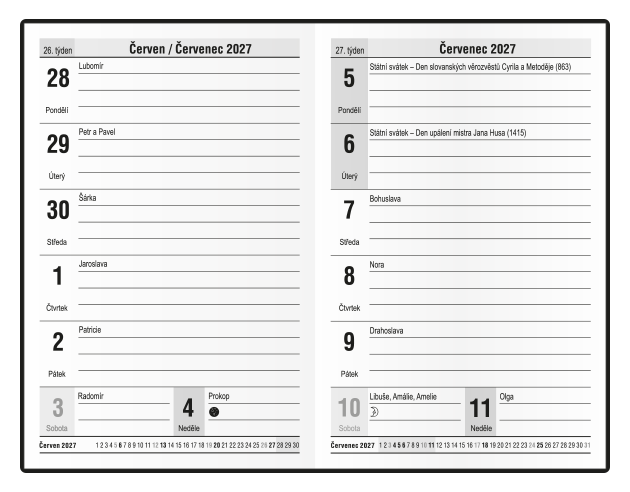 jemný hladký materiál PVC, potisk roku bílou barvou, šitá vazba V1 // ofset, 70g/m2
