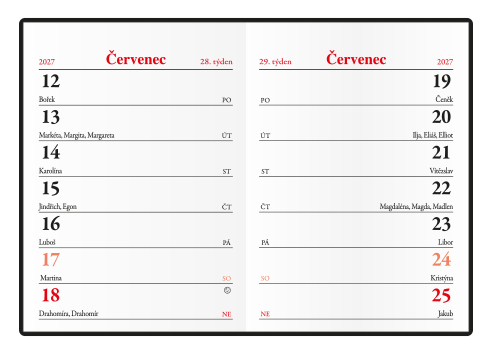 jemný hladký materiál PVC, potisk roku bílou barvou, šitá vazba V1 // ofset, 70g/m2
