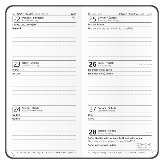 tištěná grafika potažená nepoškrabatelným matným laminem se zlatou ražbou roku, šitá vazba V8, stužka, gumička, perforované rožky, kulaté rohy // ofset, 70g/m3