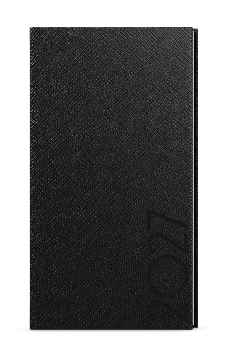Kapesní týdenní diář v černé barvě se strukturovaným povrchem. Moderní doplněk do každé kapsy. Diář má velký prostor pro poznámky a plánování.
