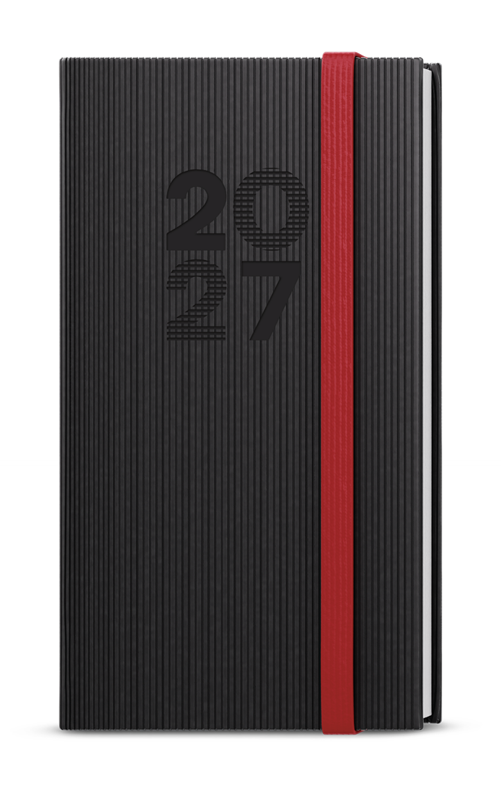 Kapesní týdenní diář v černé barvě ze strukturovaného materiálu a s gumičkou. Jednoduchost, která neomrzí. Moderní doplněk do každé kapsy. Diář má velký prostor pro poznámky a plánování.