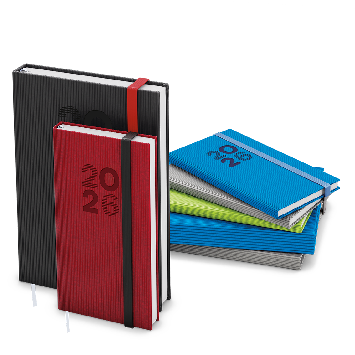 strukturovaný materiál, ražba roku, šitá vazba V8, stužka, perforované rožky, gumička, ofset, 70g/m2