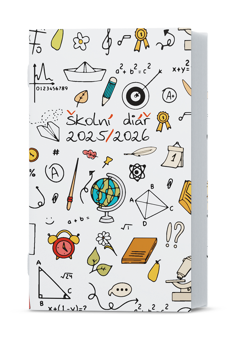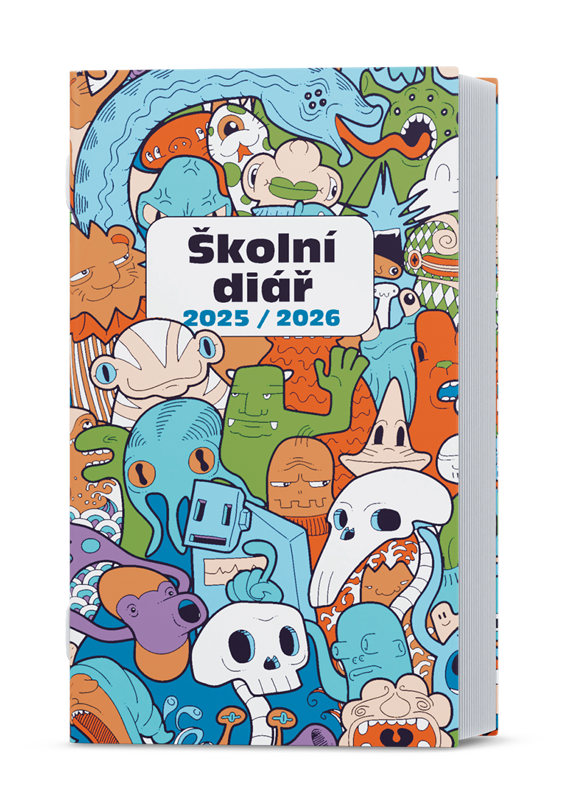 Školní diář s moderní grafikou pro školáky. Všechno důležité pro školáky pohromadě - rozvrh hodin, chemické prvky a také pravopis českého jazyka.