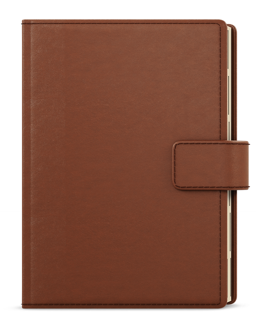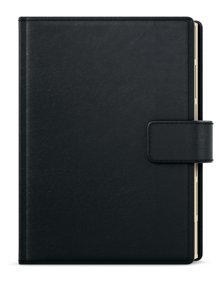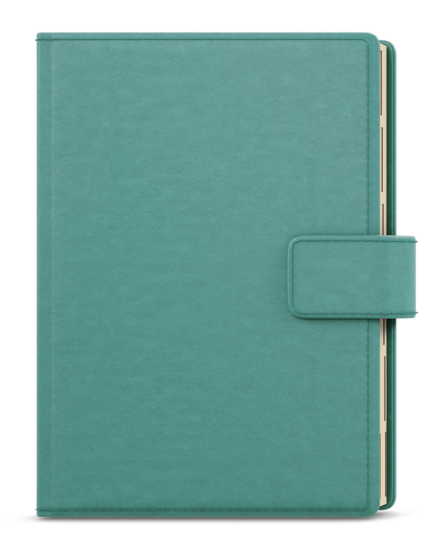 jemný matný materiál, oboustranná pěnová výplň desek, obšití v barvě potahu, magnetická přezka, poutko na tužku, 3 vnitřní kapsy, šitá vazba V8, kapitálky, stužka, perforované rožky, papírová manžeta // ofset, 70g/m2, krémový papír